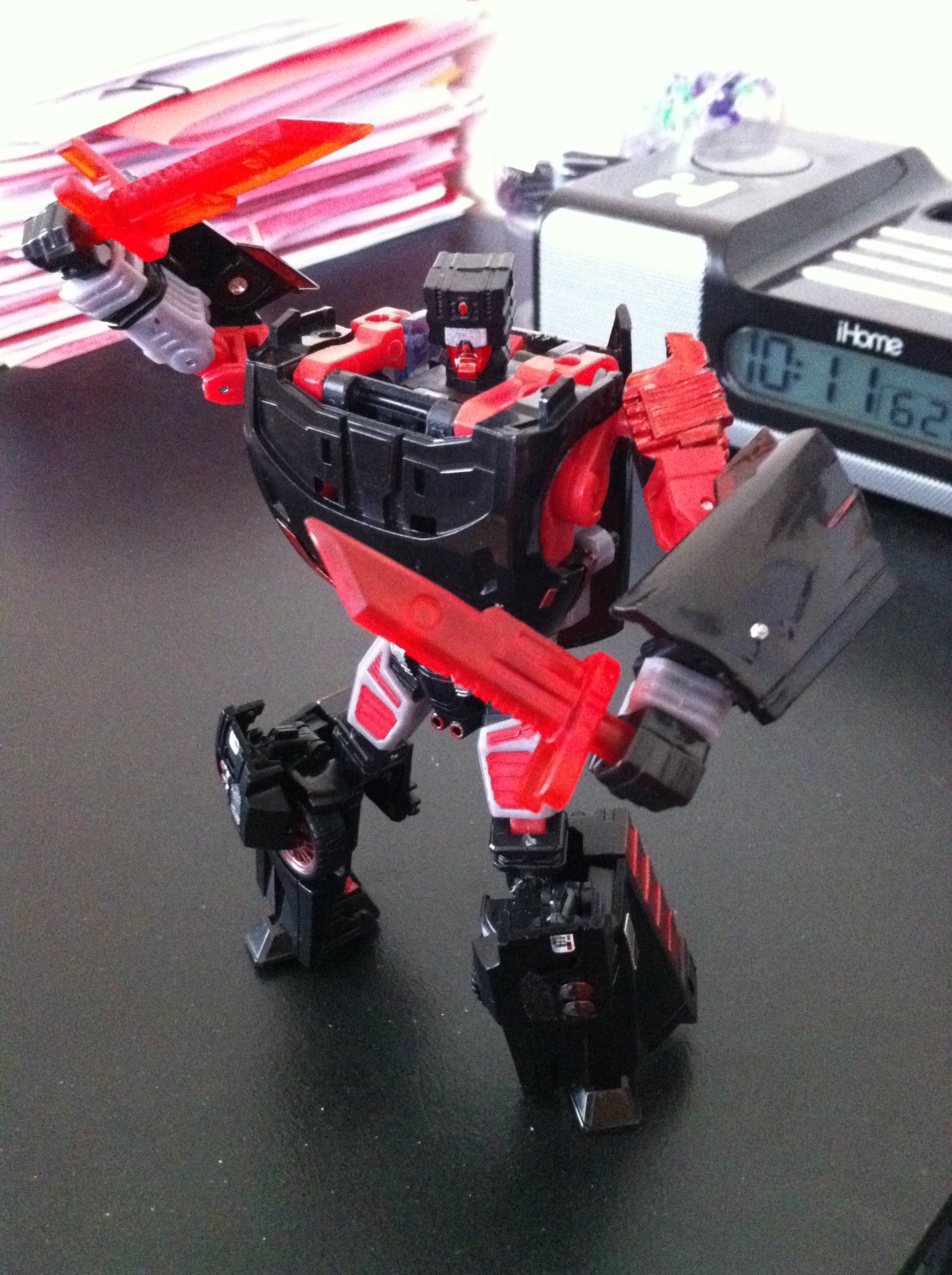 Here he is in robot mode. I actually sacrficed my Red Alert to get some spare parts as the DIY kit was GOD AWFUL in quality. (also, don’t mind the background, future projects will be taken in my mock-studio) – I gave WildRider two energon daggers from the 3rd part Head Masters “Butcher” kit. I think they work well with his red limbs and such.