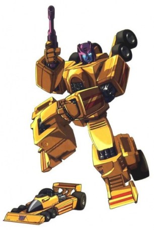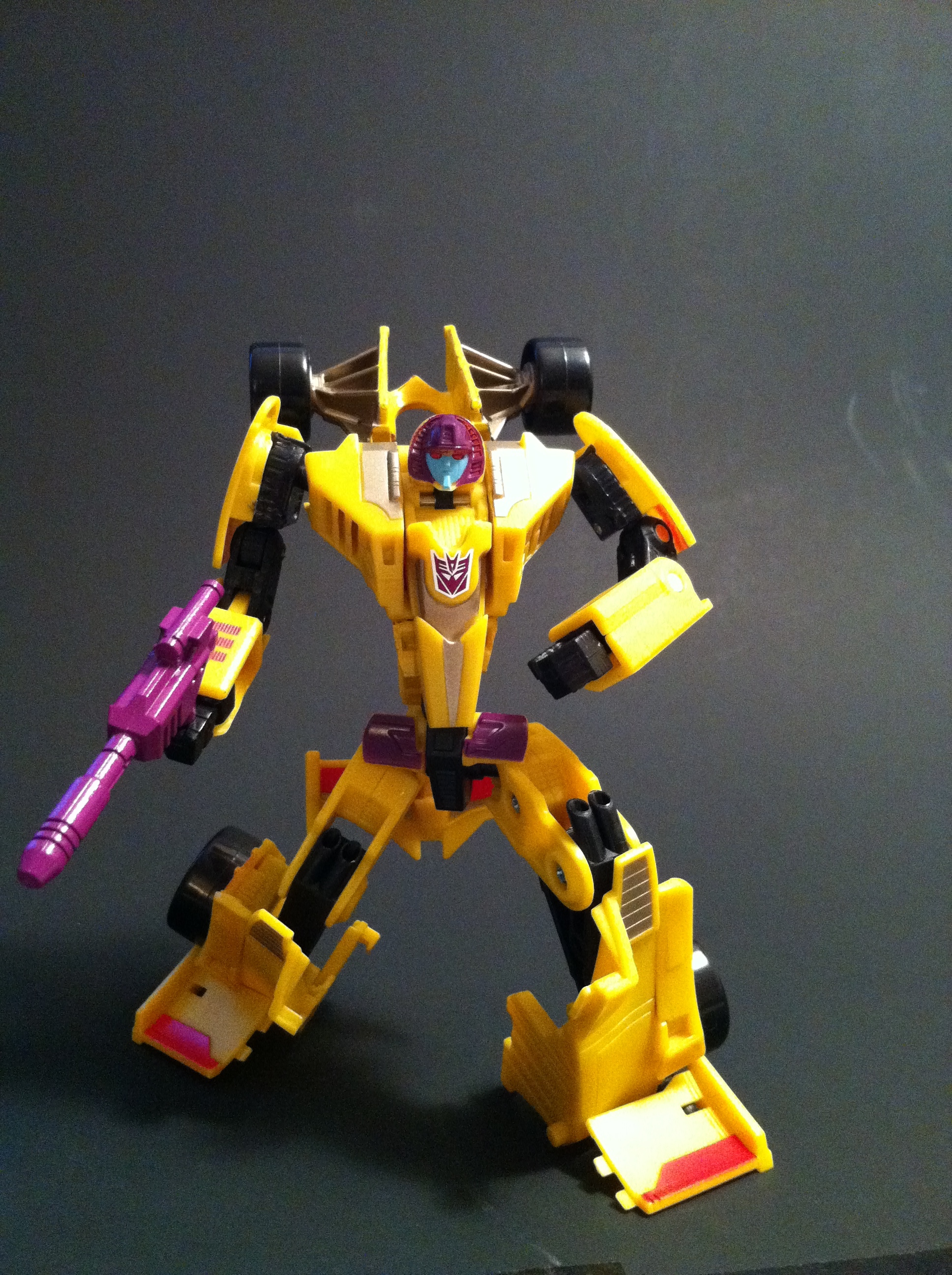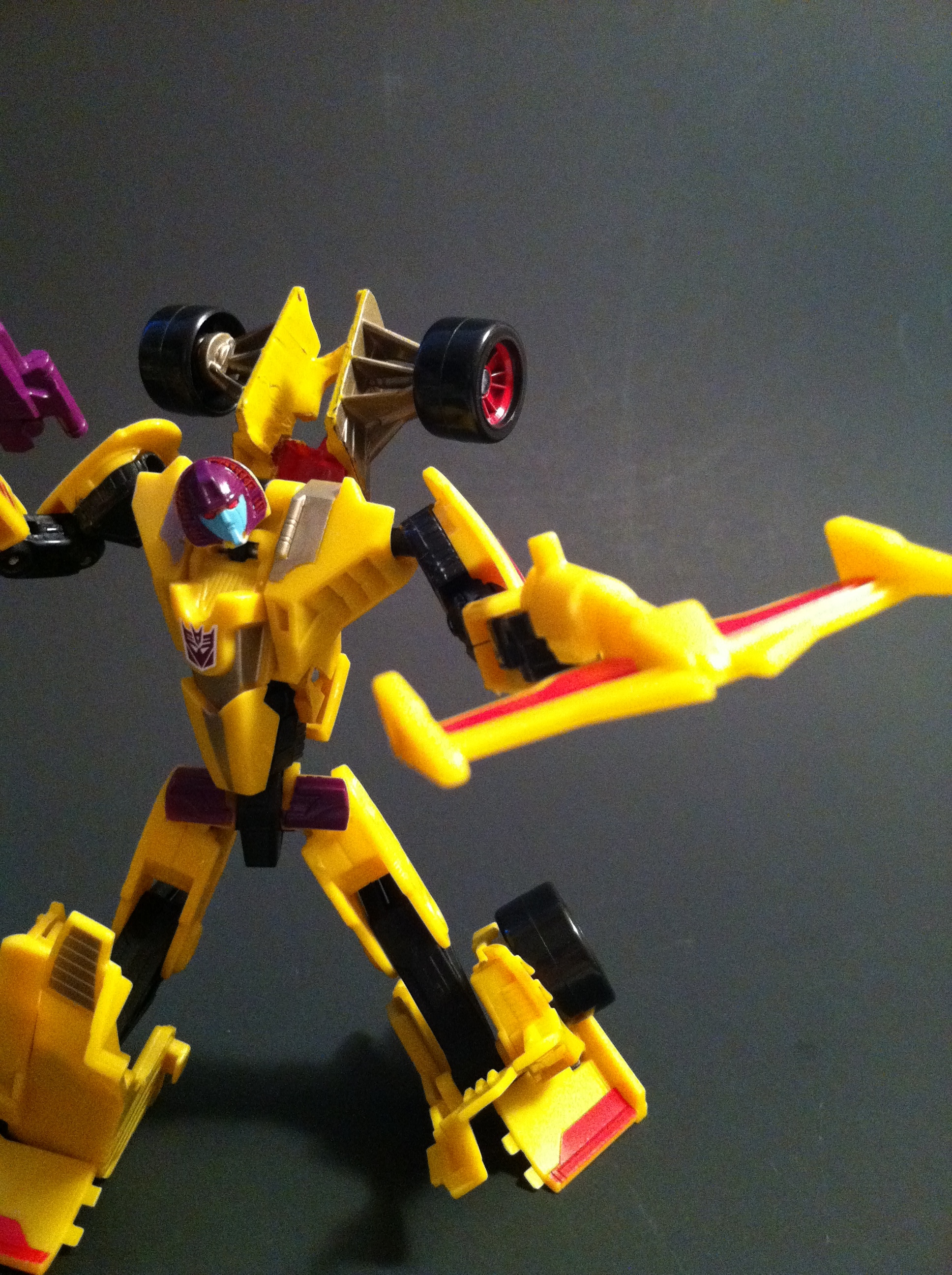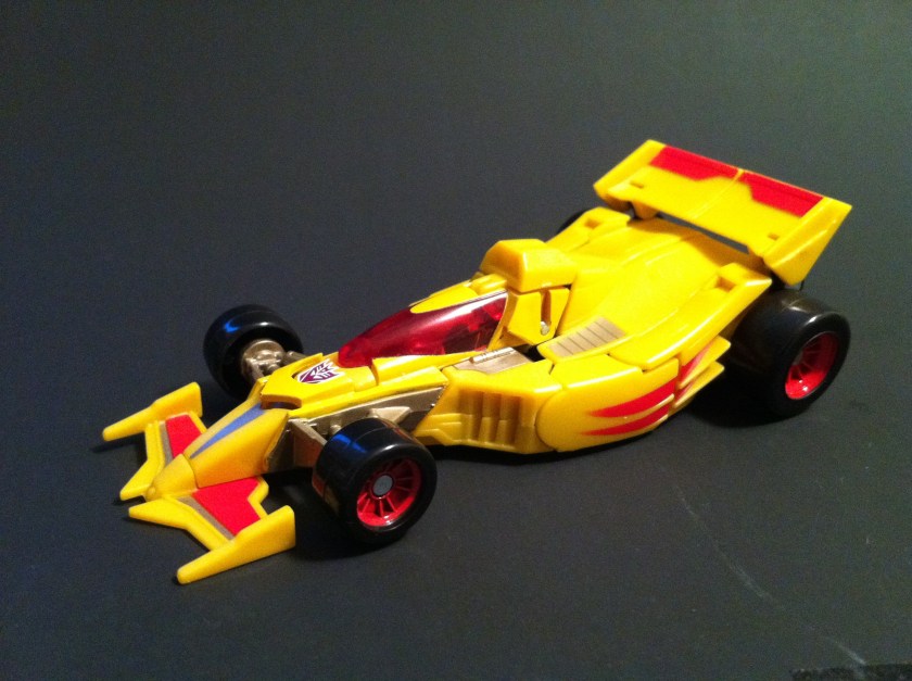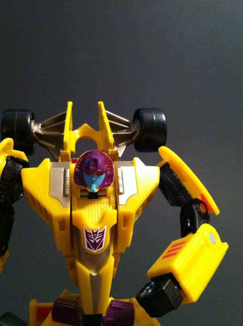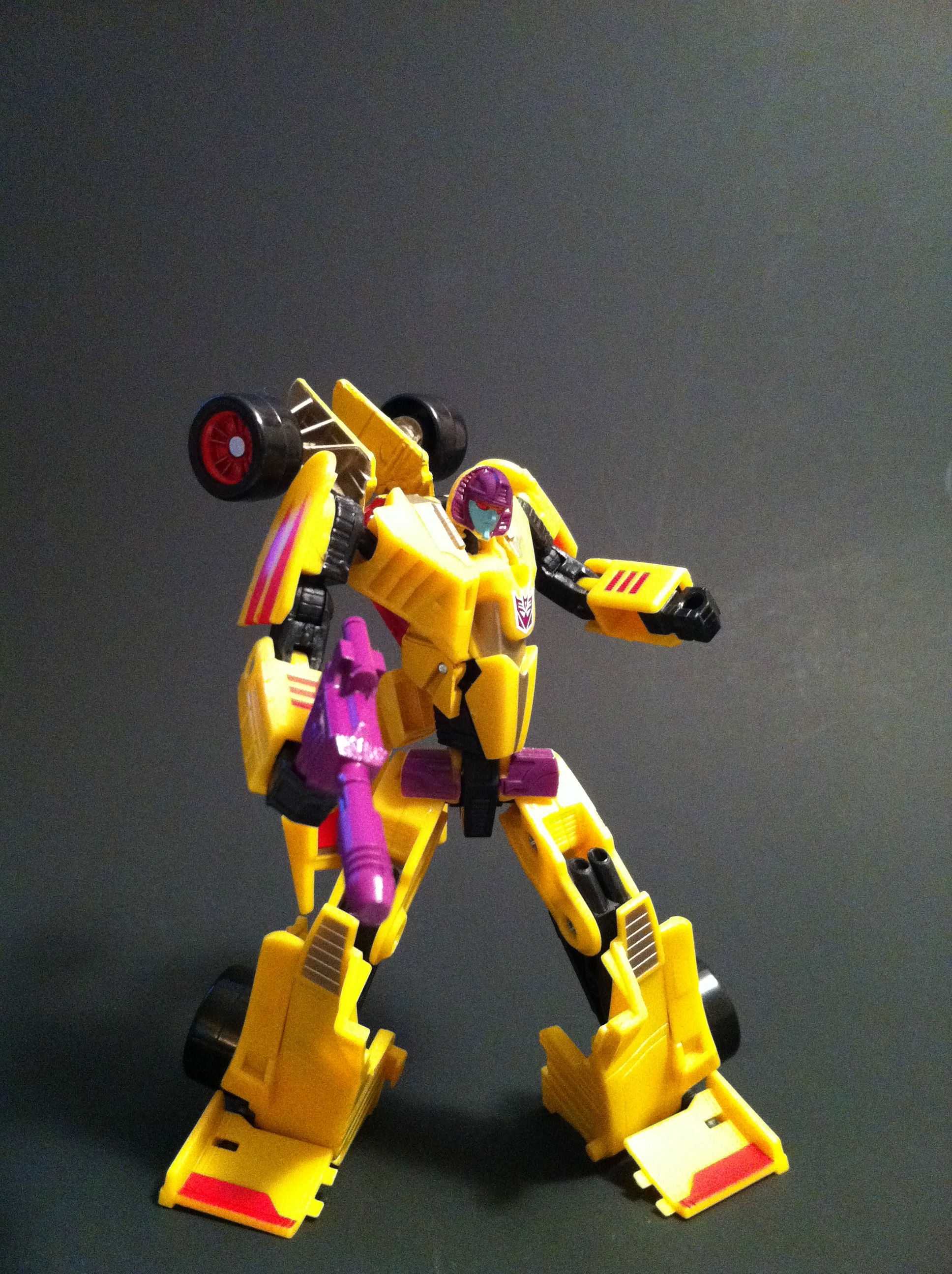 His alt-mode is awesome too, though some people complain that the yellow is too bright, but BAH! I say, BAH. He is missing his signature second set of tires up front, and there is a simple mod that you can use to install them, but you need another Drag Strip or Mirage so PFFFFFT to that.