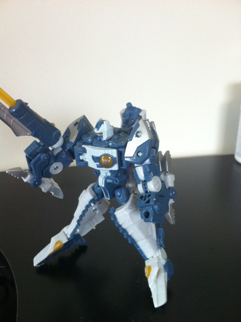While his Tyrannosaurus Rex mode is really great, I can’t help but agree with a lot of the issues people have with this mold’s Robot mode.  Don’t get me wrong, Overkill looks amazing in the white and blue and I’m so glad to see they gave him a yellow visor for his eyes!  But the legs suffer from a severe lack of pose-ability and the shoulder assembly doesn’t lock into place, which is unfortunate.