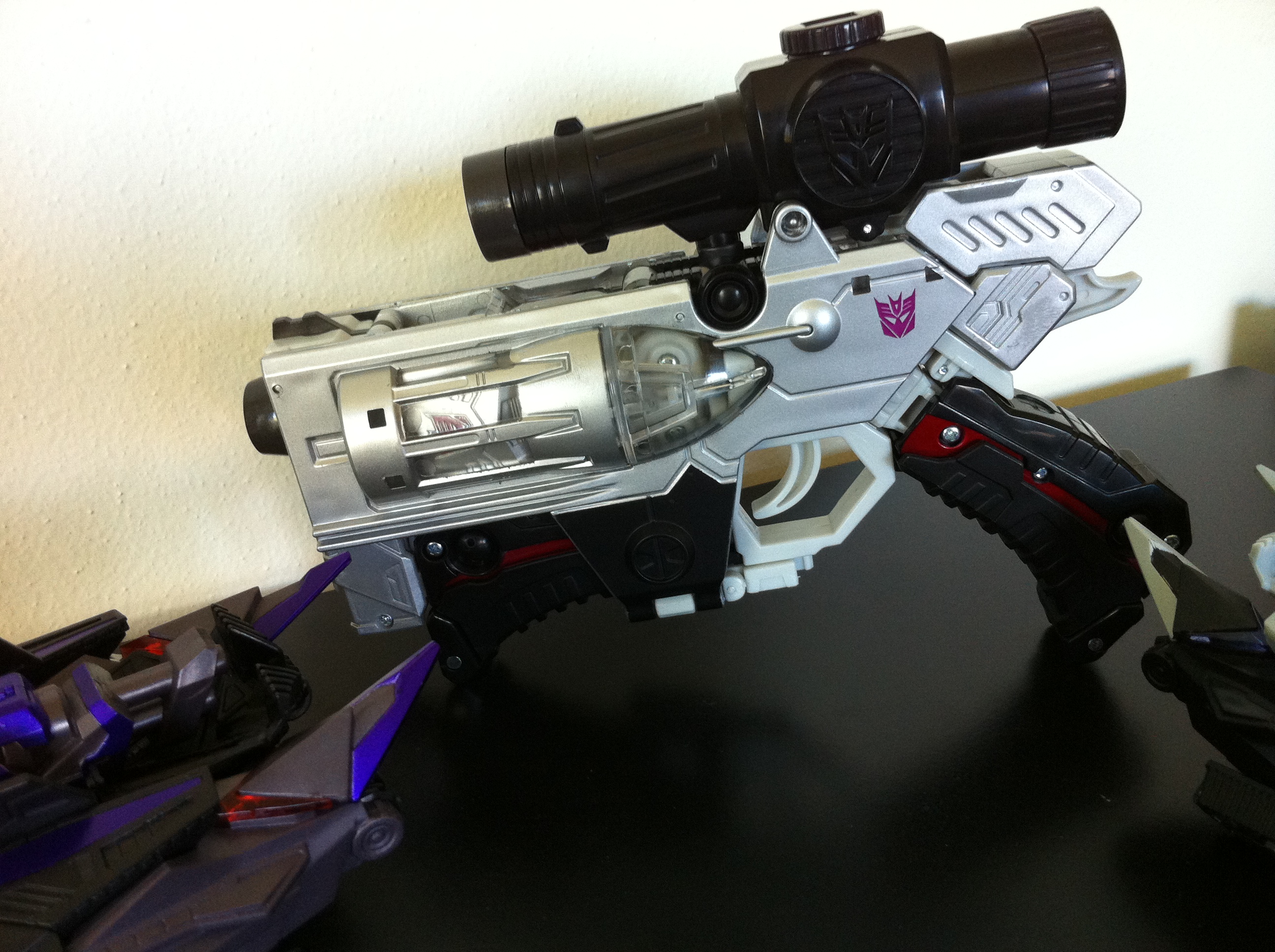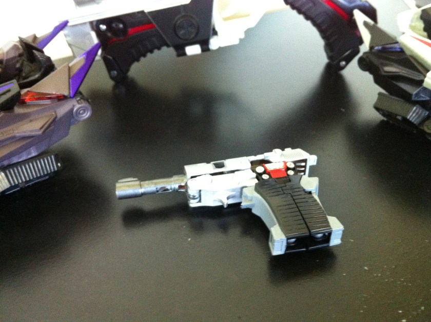 His gun mode is pretty amazing in this paint scheme.  The original version of this mold was colored in green and purple and looked like a Nerf Gun, which is what the design is based on.  But because Takara used Silver and Black, you get this, amazing looking hand gun (albeit with a short barrel). I really like how it allows Megatron to assume his original concept of being a hand-gun.