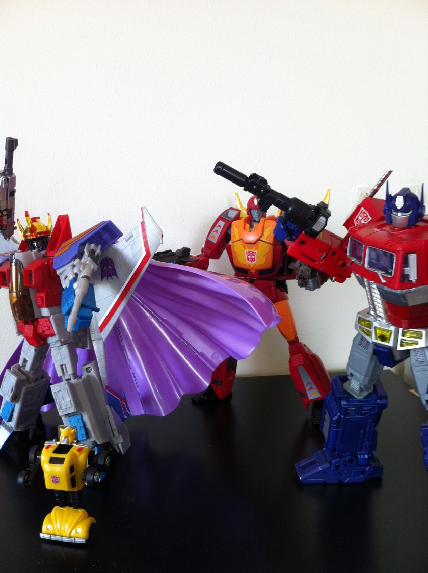Finally, here’s a size comparison shot with Prime and Hot Rod. I couldn’t fit Grimlock in, but you get the idea: