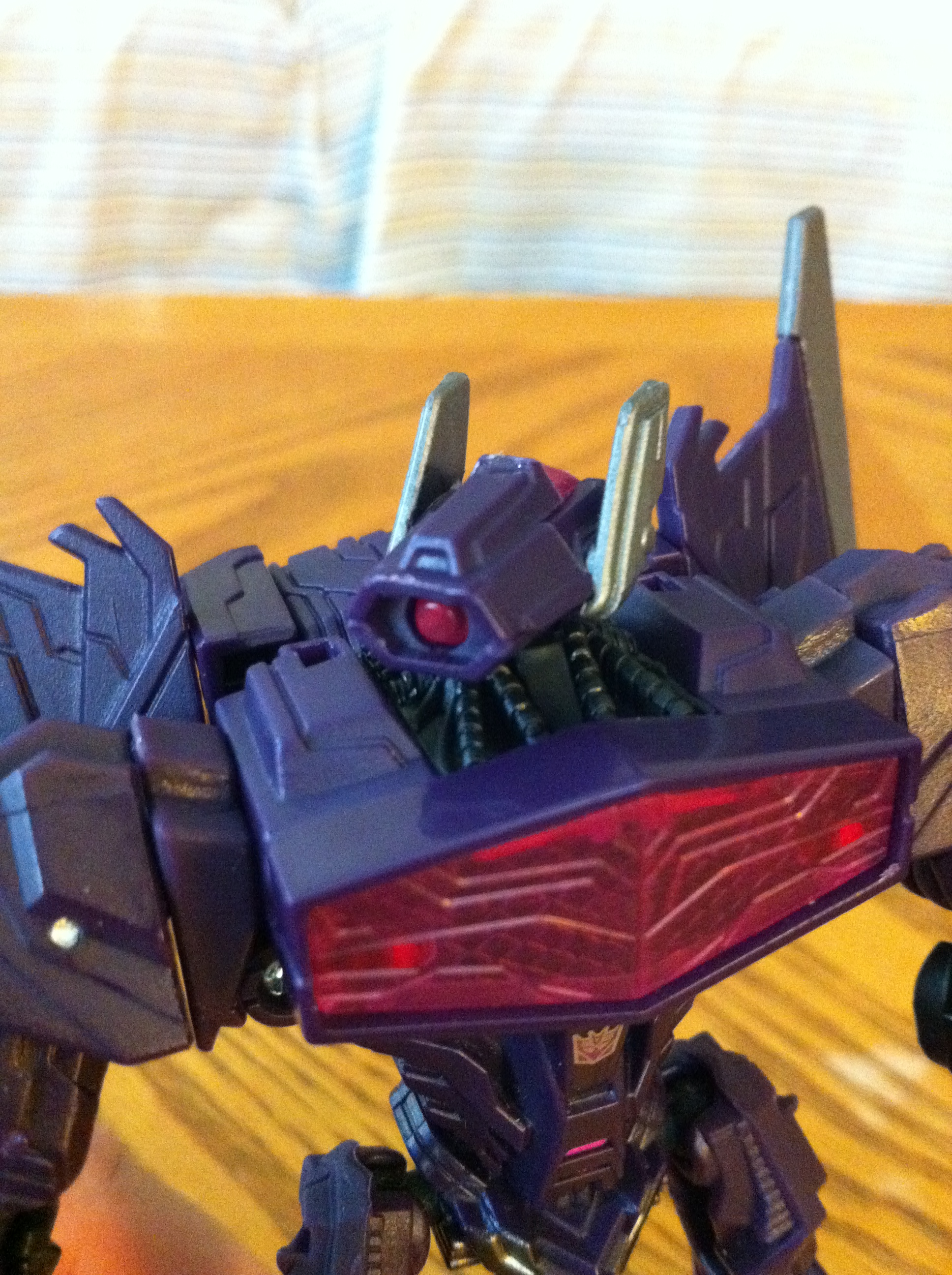 Shockwave’s head sculpt is fantastic and the detailing around his neck and collar are great,  but….everyone knows Shockwave’s eye is yellow, not pink.  I realize they did this so that the light piping works (and boy, it works great!) but I may considered painting over it with yellow/gold.   I’m not sure yet.
