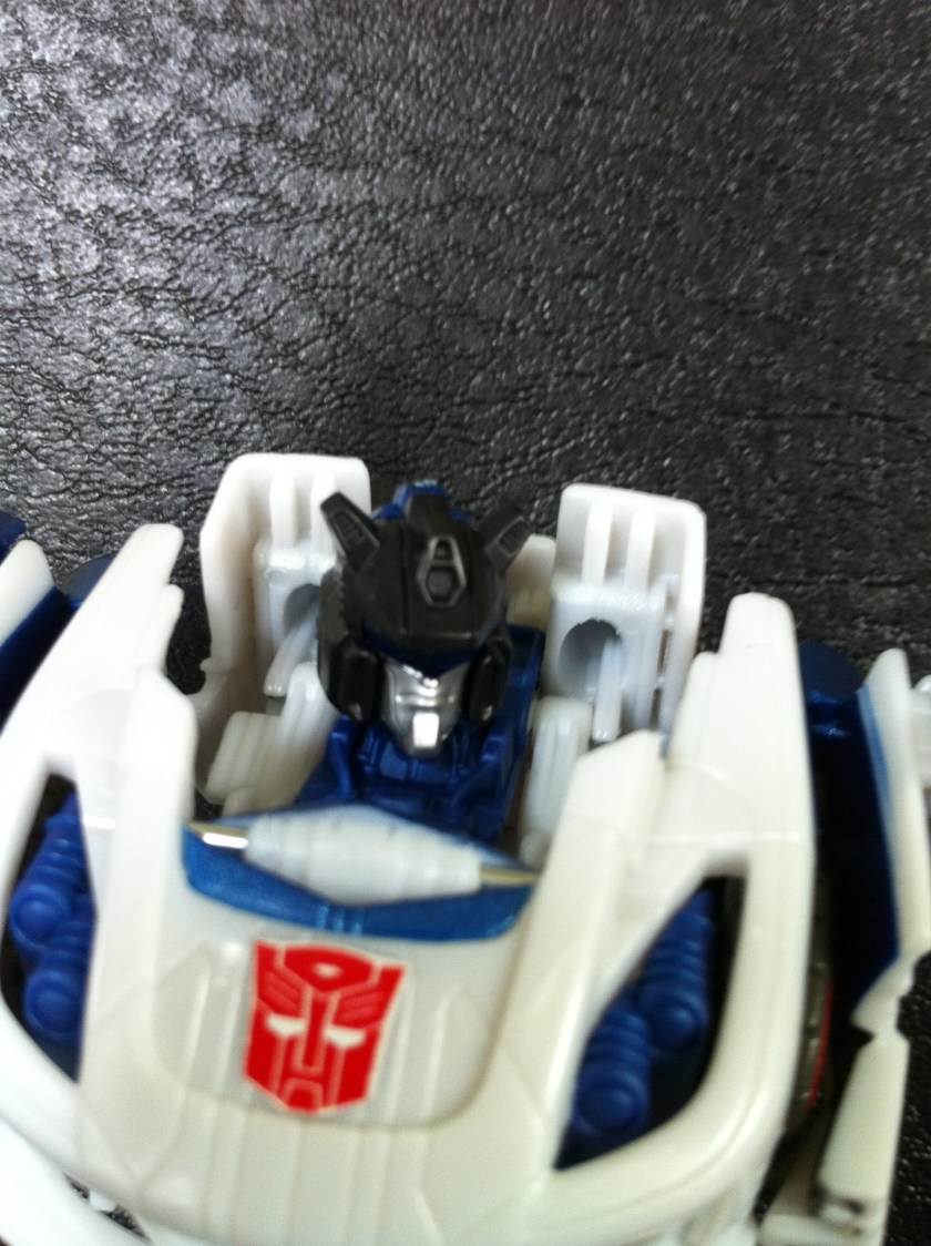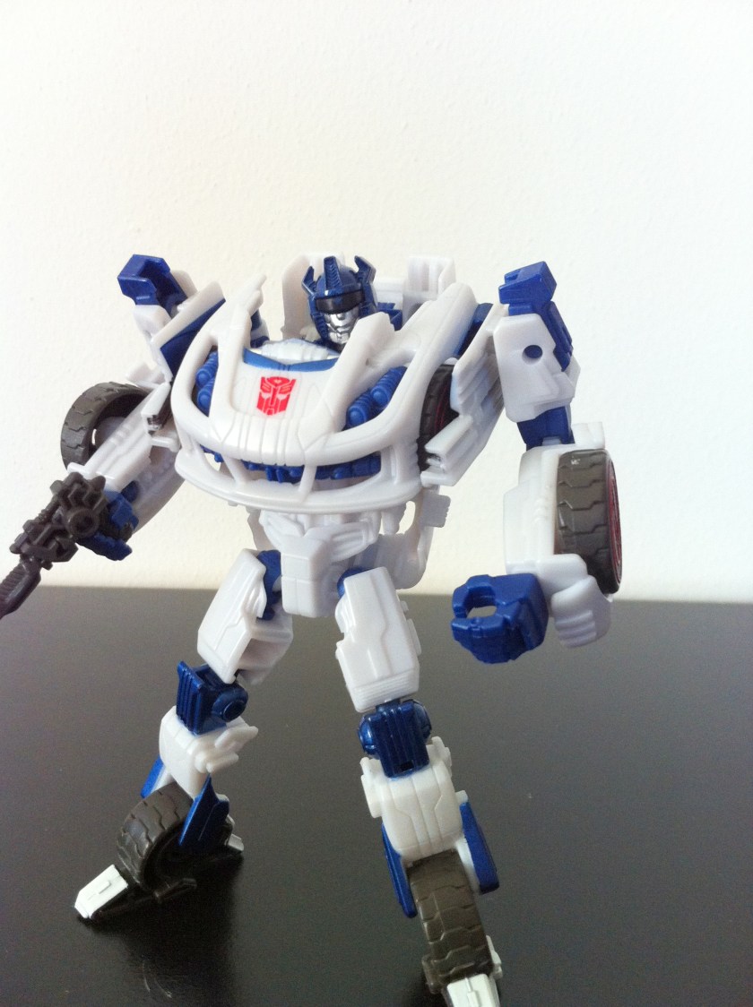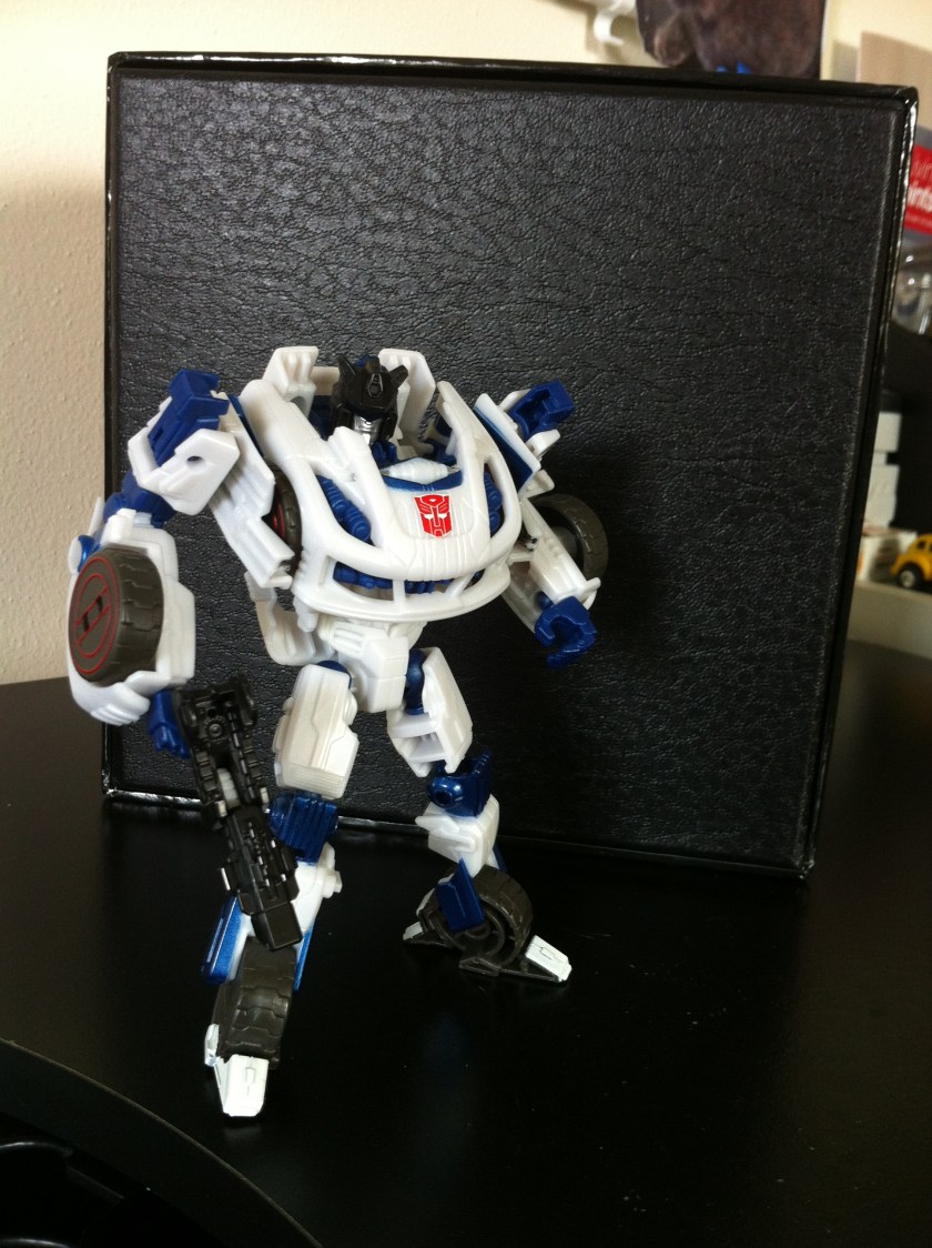 As much as I’m biased towards anything Jazz, there are some issues with the figure – for one thing, his waist piece should be black, or grey, anything but white. He looks too “All white” without some black in there to break up the waist and the chest.  I also appreciate that Hasbro wanted the wheels in his ankles like the game model, and so had to basically mold them into the legs, but I think he could benefit from some ankle articulation.    Its just a bit unfortunate that you can still see his front tires on the chest as well, making it seem like he has six sets of tires.