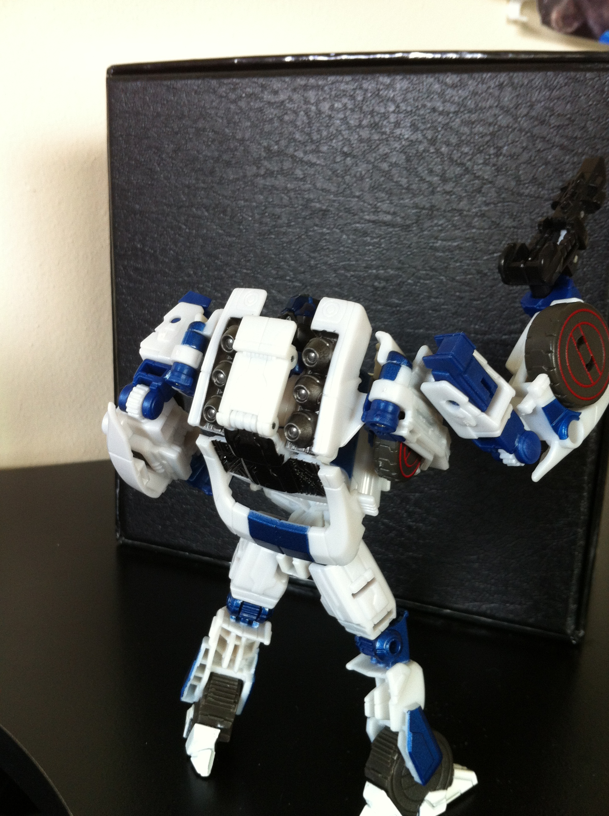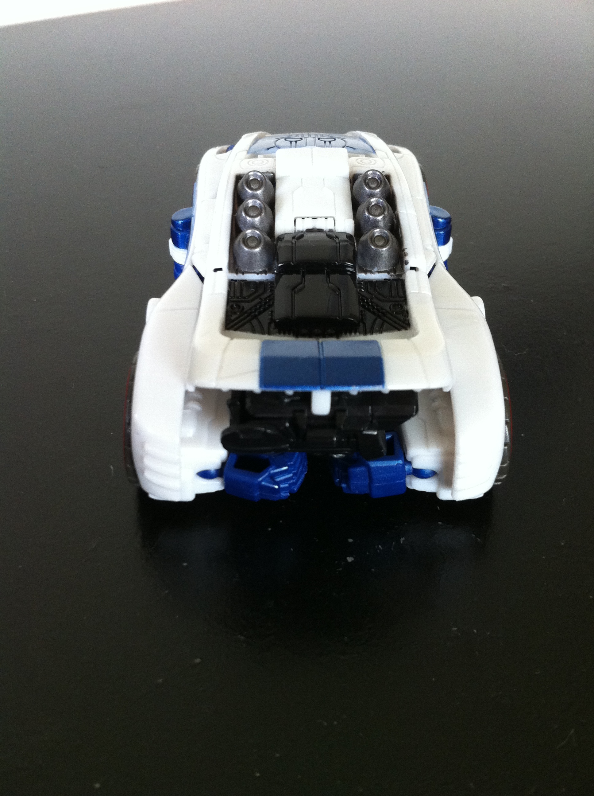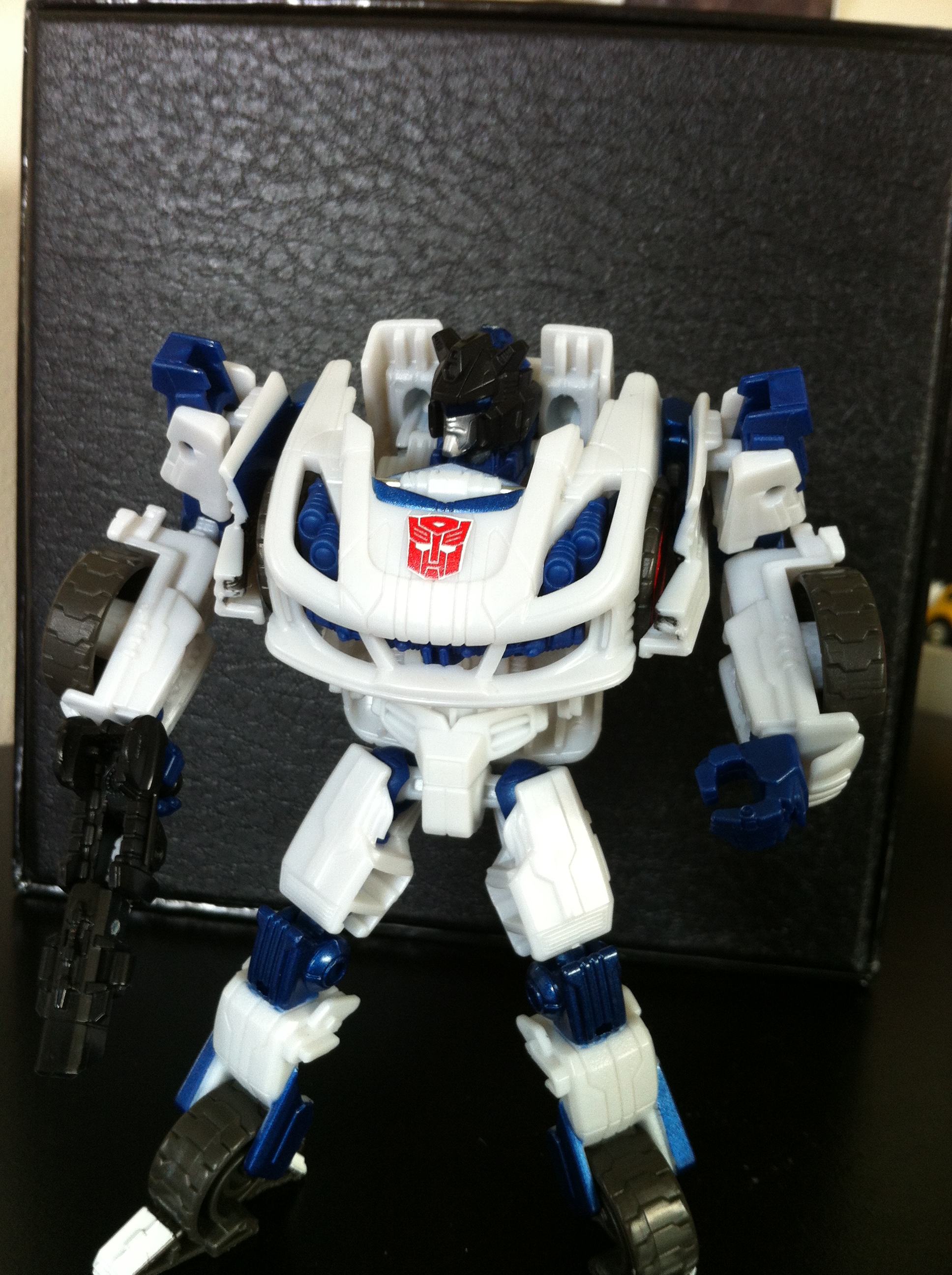 As much as I’m biased towards anything Jazz, there are some issues with the figure – for one thing, his waist piece should be black, or grey, anything but white. He looks too “All white” without some black in there to break up the waist and the chest.  I also appreciate that Hasbro wanted the wheels in his ankles like the game model, and so had to basically mold them into the legs, but I think he could benefit from some ankle articulation.    Its just a bit unfortunate that you can still see his front tires on the chest as well, making it seem like he has six sets of tires.
