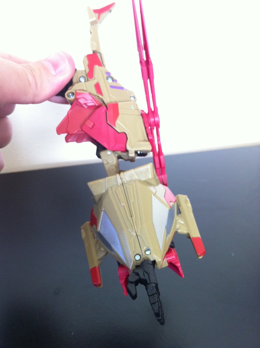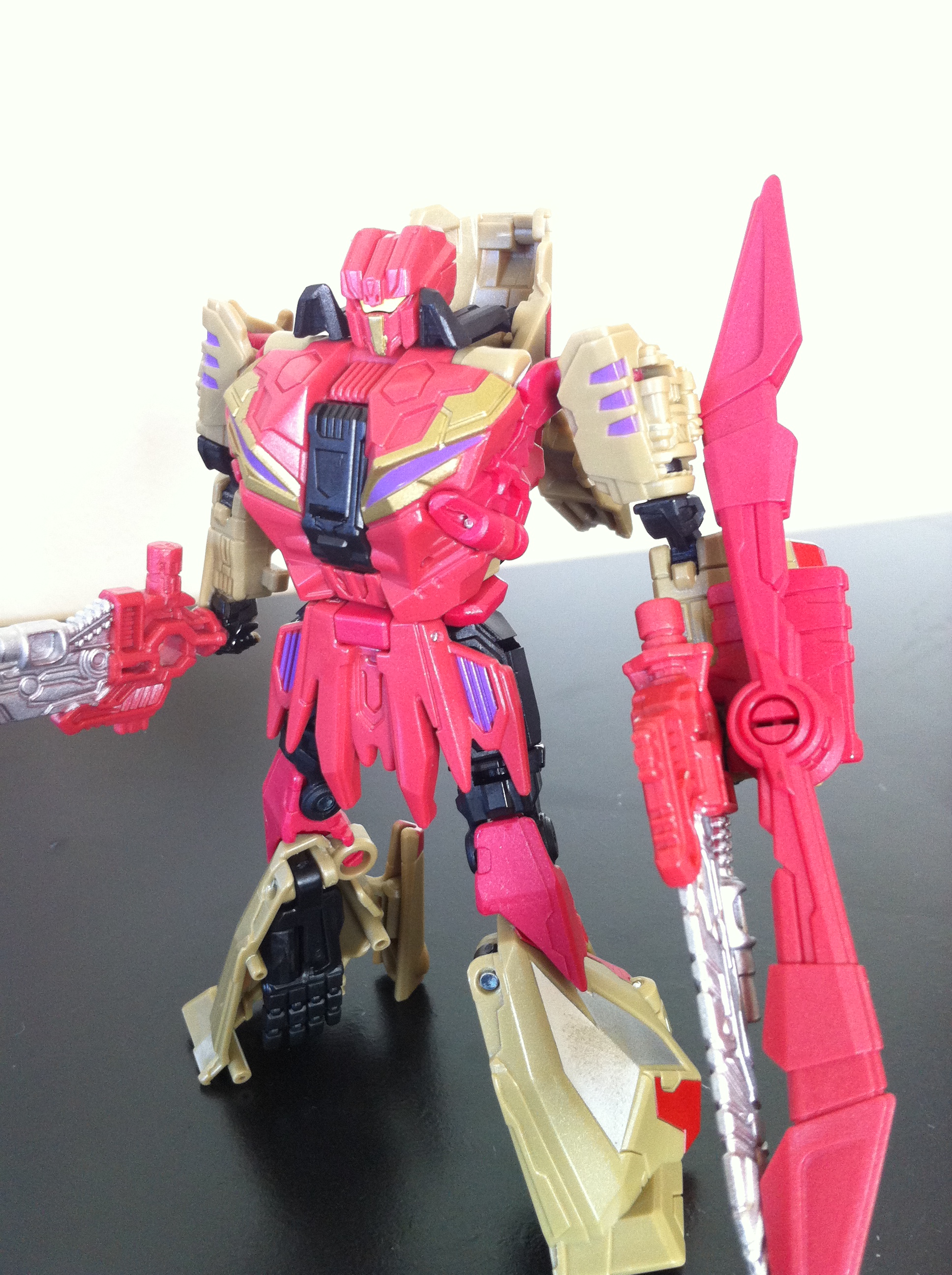 But that’s just a concept design.  As it turns out, the figure is actually far more game accurate than the picture.   Vortex has a lot of, what I call,  “Pink” in robot mode, but somehow it doesn’t look bad.  His green/tan is actually very game accurate as well, now that I’ve played the demo.  In fact, I’m starting to realize that the SDCC set is not actually “G1” colors, but “In Game” colors.  That’s why there are variations to the originals.   But enough of that, on to Swords McStabby here: