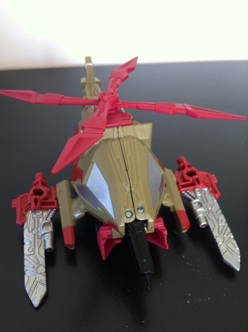 Nothing too particularly good or bad about it.  For some reason I have a lot of fun just spinning those chopper blades.  I guess my only issue, aside from the somewhat obvious leg kibble up front, is that I don’t like that the swords store on the side rails.  See those tabs at the top of each hilt?  I was hopping they would slot in somewhere underneath or something.  Its not bad, I just think it looks a little too…well…sword-y…for a helicopter.  Again, I like robot mode having them but I wish they could store hidden in chopper mode.