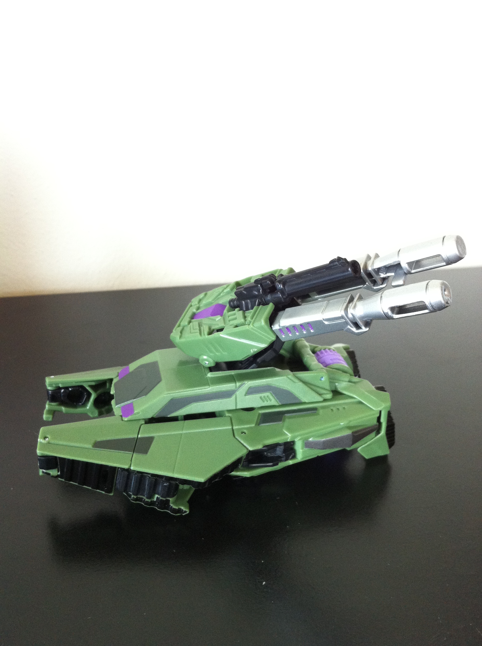 Brawl’s alt-mode is, of course, a (Hover) Tank.  He had a design already from War for Cybertron and they did a pretty good job of replicating it, albeit a bit on the small side…and streamlined.    I guess I can see how some people would be put off by it – you could make the argument that its a very lazy alt-mode.  The Tank doesn’t even have proper hover treads like WFC Megatron and in fact just rests on the bottom of the vehicle.  But I’m not sure anything else would have worked without getting in the way of being a limb.