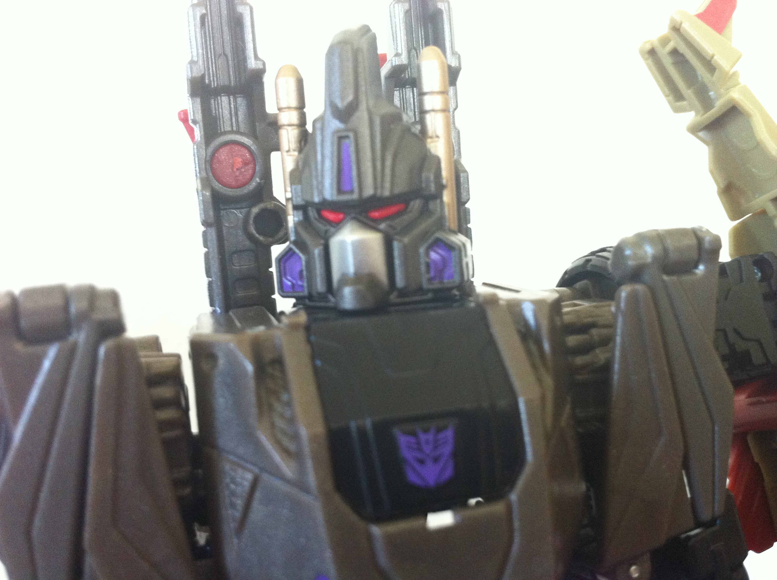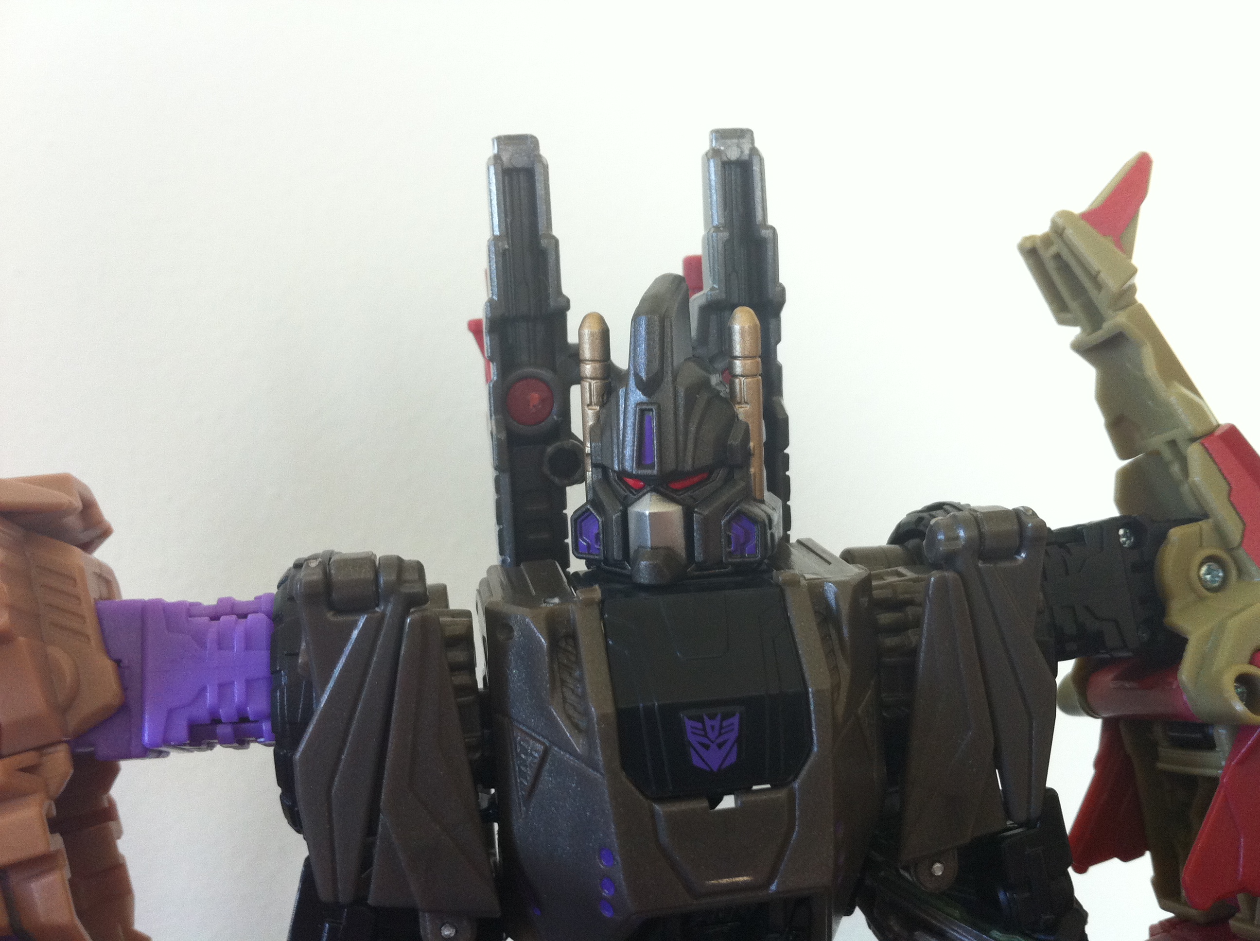 I’m not sure how I feel about the “shoulder wings” – I know they should be up, but they seem to look better down. I do have to say, Bruticus’ head sculpt is amazing!