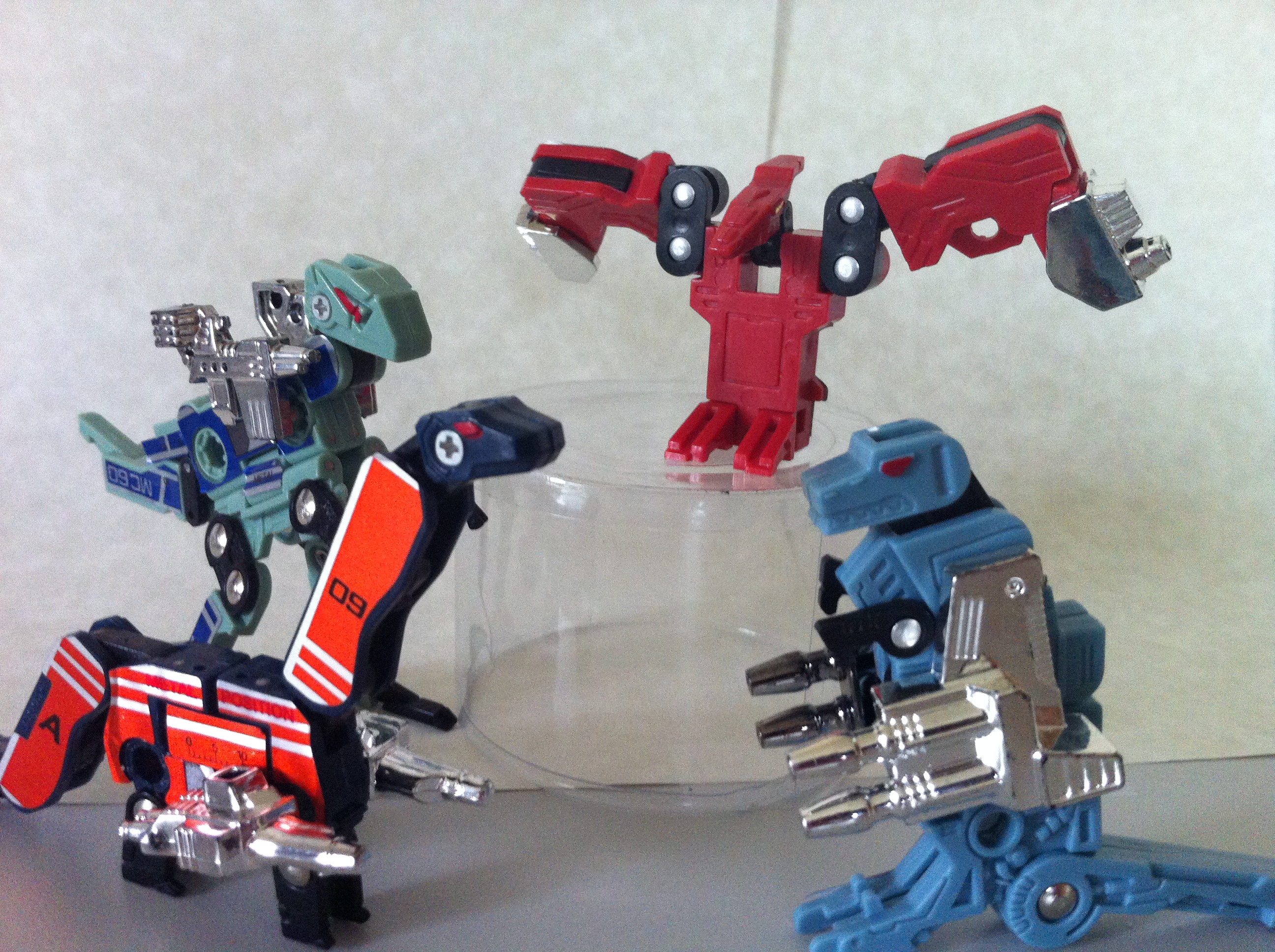 Google provided the answer: Four Autobot cassettes released only in Japan – Four Dinosaur cassettes.  That combine into robots like Grandslam and RainDance.   Legout and Decible are on guitar.   My mind was blown.   Then my mind was melted into mush when did an ebay search and came across one set, Dial and Saur, running for 1500USD.   I dug further, my curiosity only trumped by my amazement that after nearly 20 years, there actually WERE cassettes I had never seen.  But as I learned more about the dynamic foursome, I slowly realized that they were exceptionally rare, even by Japanese G1 standards, and a set for 1500.00 was actually a pretty good deal.  My heart sank a little.