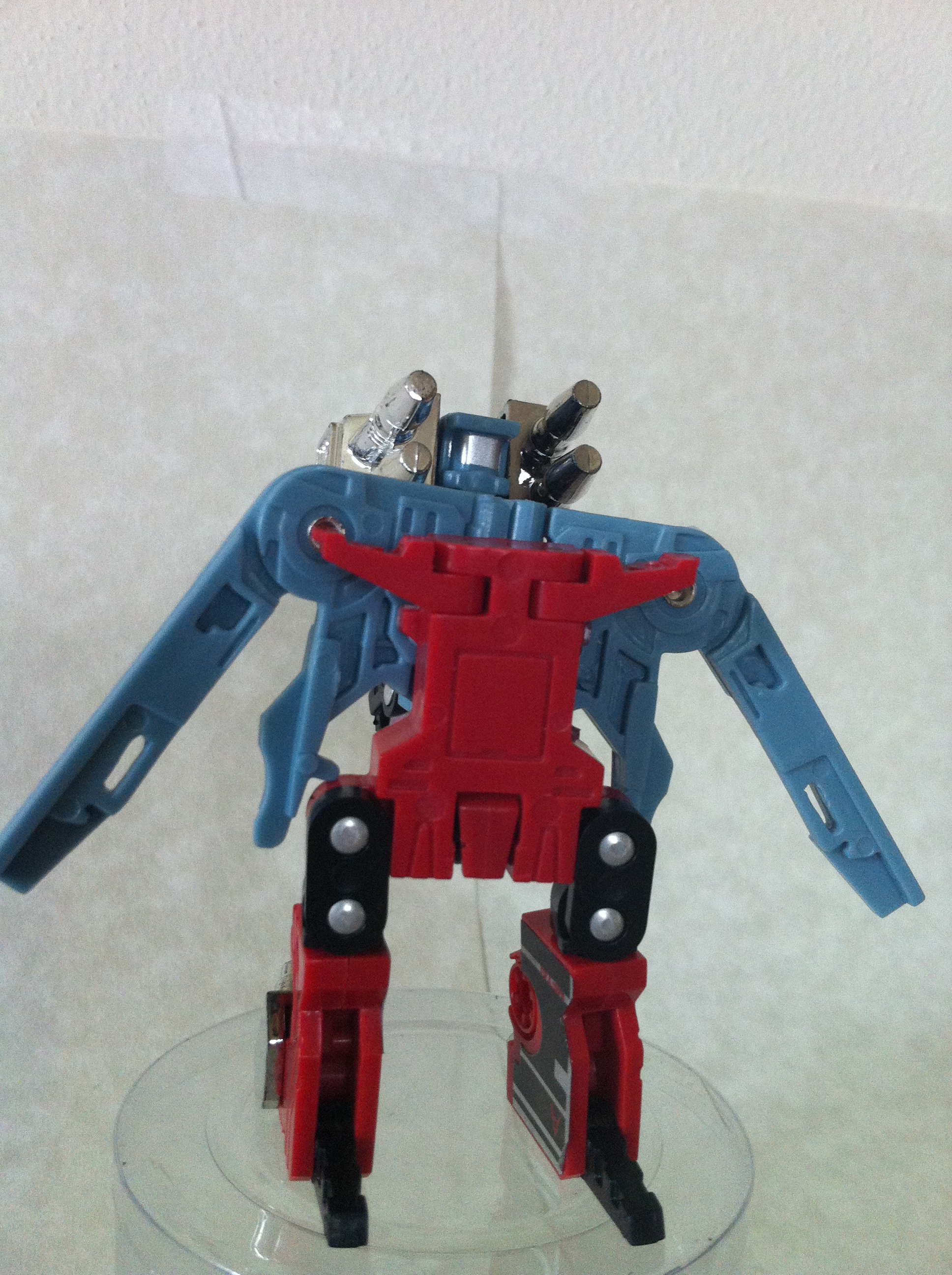 Then there’s Decibel.  I realize that the combined robot modes tend to fall short compared to their box art (and Spotlight Art…man I wish I had a little guitar I could give him…) but really, I LOVE how Decibel looks.  His face reminds me of G1 Bonecrusher, which is awesome.  You rarely see a Square Visor face anymore, and its a look I think really works.  I also like that he’s a bit bulkier than the others.  Legout is more 3-D than Bulky and SlamDance is completely flat.  Also, Decibel’s feet are amazing for a G1 cassette combiner team.  Graphy has tight feet extensions that pull out in front, then his weapons create ankle bracers in the back, giving Decibel a very sturdy, well balanced support.   Noise splits in half and opens up to create the chest and arms, and the head folds out from Noise’s back, which is really cool (Legout’s head does the same thing..kinda).