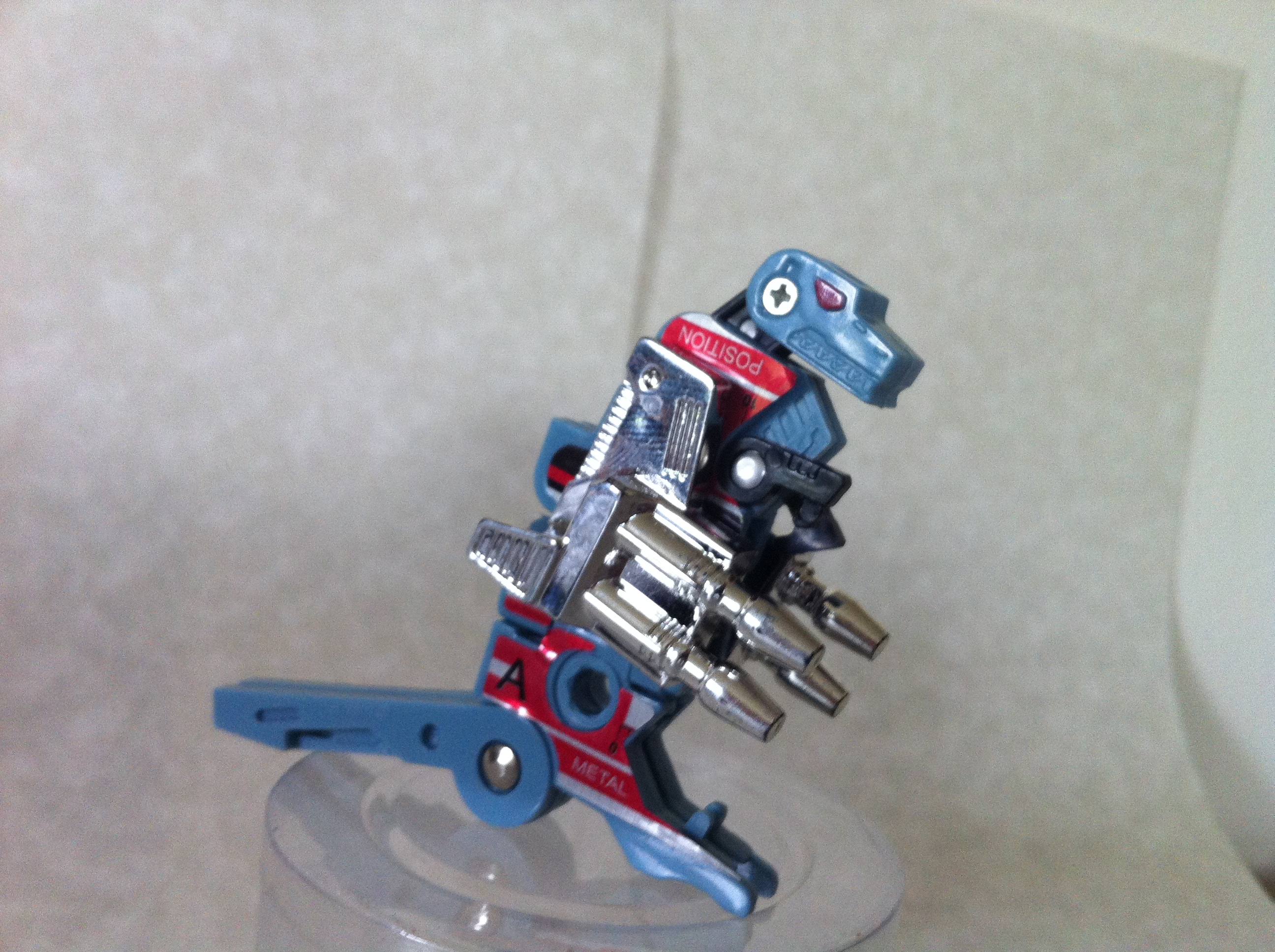 Now, Noise was someone I was on the fence about since I saw pictures of him, mainly because I kept seeing him with his legs split apart (for balance) thus making it look like he had two tails for some reason.  I was very happy to find out you really don’t have to do this, and it keeps him looking normal with one tail in Dino-mode.  Why I didn’t think of putting Overkill up with him I have no idea, but this is about the Autobot Dino Cassettes so its no big deal.  Noise’s cannons are quite big, and I’ve seen him with them upside down, which doesn’t look horrible at all.  He’s a cool dino, but I think I I’ve got a brain block about Overkill and when I see Noise I think “been there, done that”.  Still, I really like his colors and his transformation is really unique.  He basically splits in the middle and folds end over end, unlike Overkill who’s head and limbs basically fold out from the main body, its quite cool!