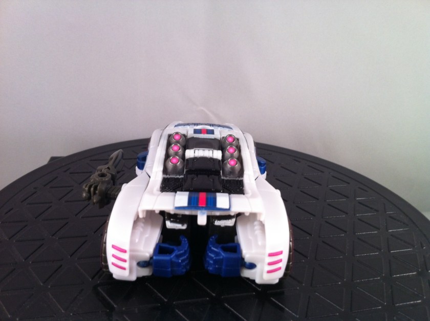 I still don’t get what the C – is supposed to be, the most common thought is cybertronian “4” but there’s no explanation. Anyway, the biggest additions are the windows, which look FAR better than the plain old white. Wheel covers are brighter red, but remain somewhat unchanged (you could probably skip them if you really wanted to) – but really, its the G1 Styling that wins it: