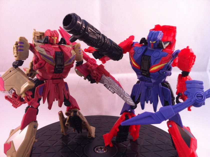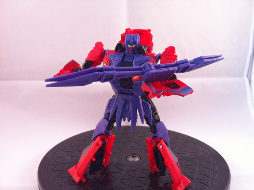 My love of Vortex has kind of waxed, waned and now is waxing again.  At first, I loved him from my SDCC set.  Then I kinda got annoyed by his lack for poseabilty.  But now, decked out in his flashy reds and purples, I’m kinda all about him again.  But really, everything about his joints are just awkward.  His double jointed weird knees, his high collar blocking his head, his weird L jointed shoulders, they’re all unique ways to get him into all three modes, but his robot mode really suffers.