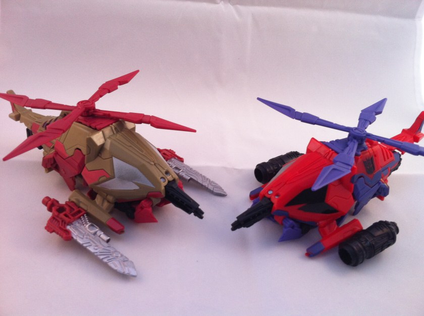 Whether they’re separated, or connected, I like the idea of him having a gun and not just a walking knife rack.  Here we see the color differences between SDCC and Retail.  Retail Vortex is…well…loud.  Like Swindle’s yellow, he just screams “HEY KIDS, BUY ME…C’MON! BUY ME!!”   But don’t get me wrong, I love it.  I love the red and purple and yellow and how they all work together…surprisingly well.    Once again though, the Decepticon symbol is totally missing from his chest.  WTF?