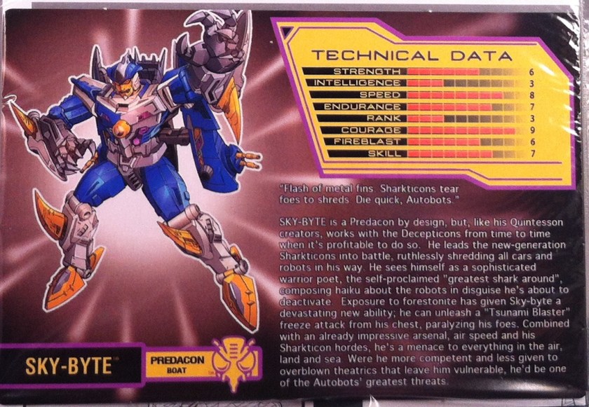 Lets move on to the ‘Cons. There are two Decepticons and one Predicon in the set – lets start with the Predicon, everyone’s favorite Poet Warlord, SKY-BYTE!