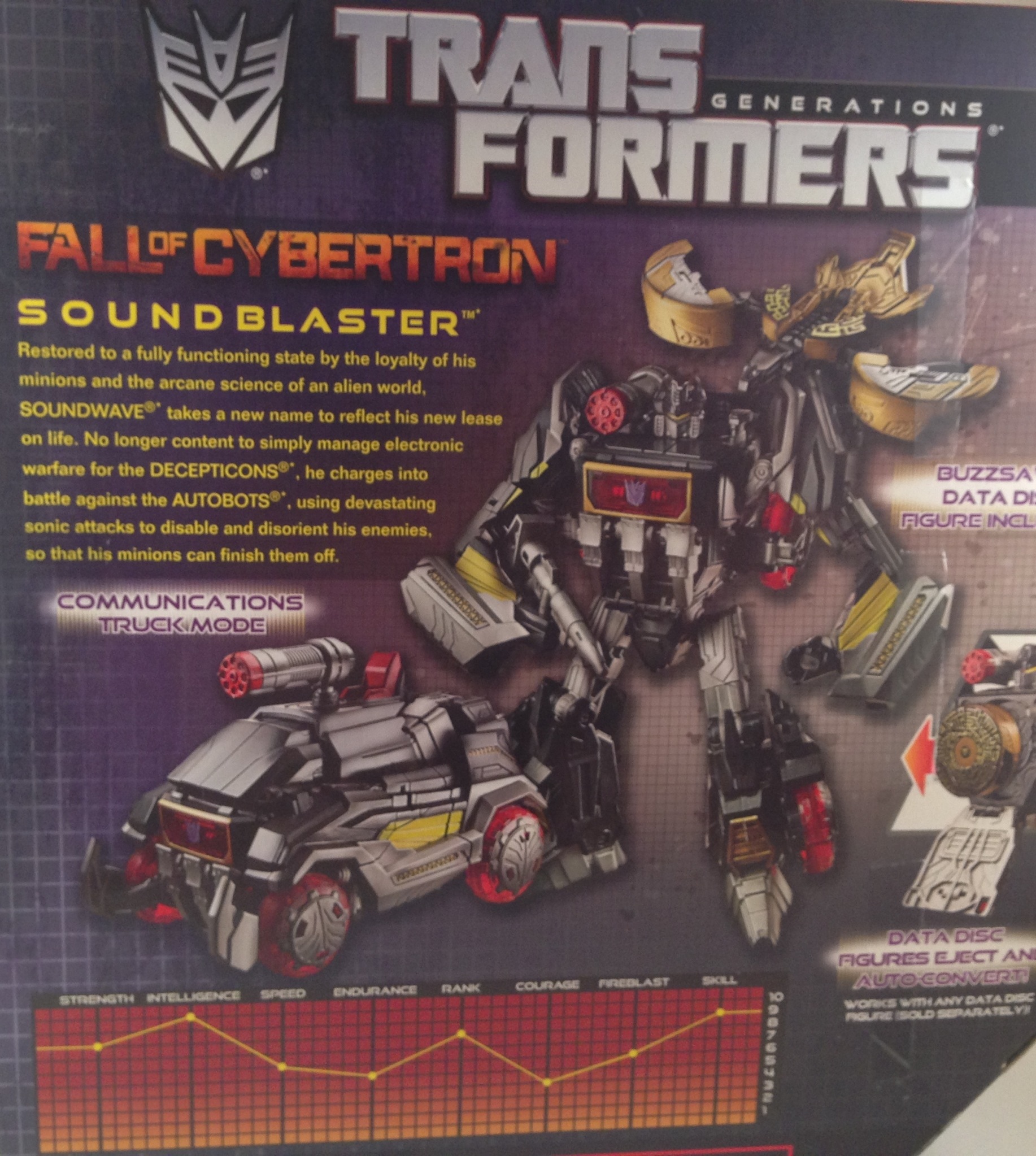 A couple of things to point out on the back: first, his bio is awesome and even gives a wink to fans of The Headmasters where Soundblaster first appeared. Second: I’m pretty sure they used the Takara picture here. He’s much darker, almost glossy and Buzzsaw is gold chrome, which as we’ll see, he is in fact not.