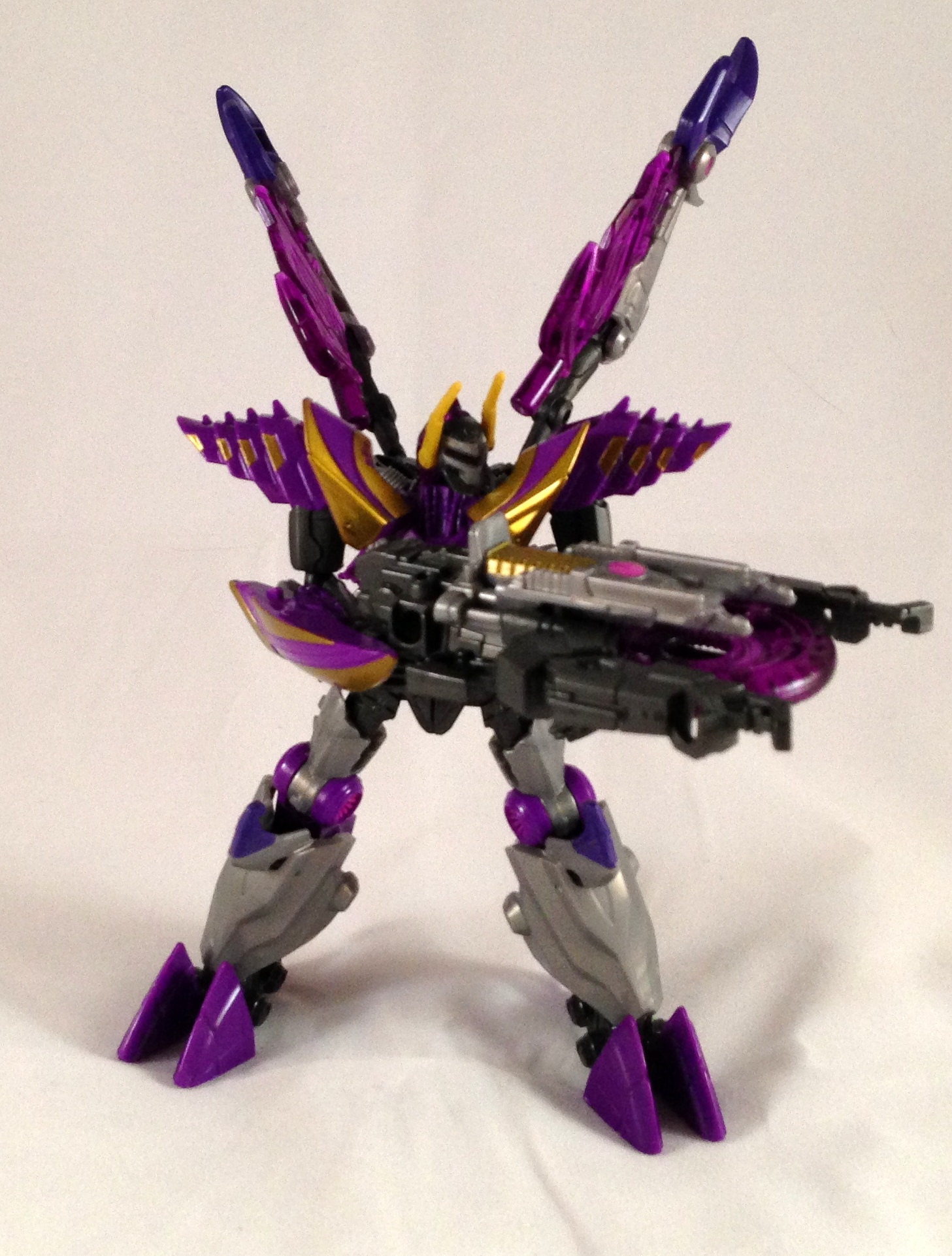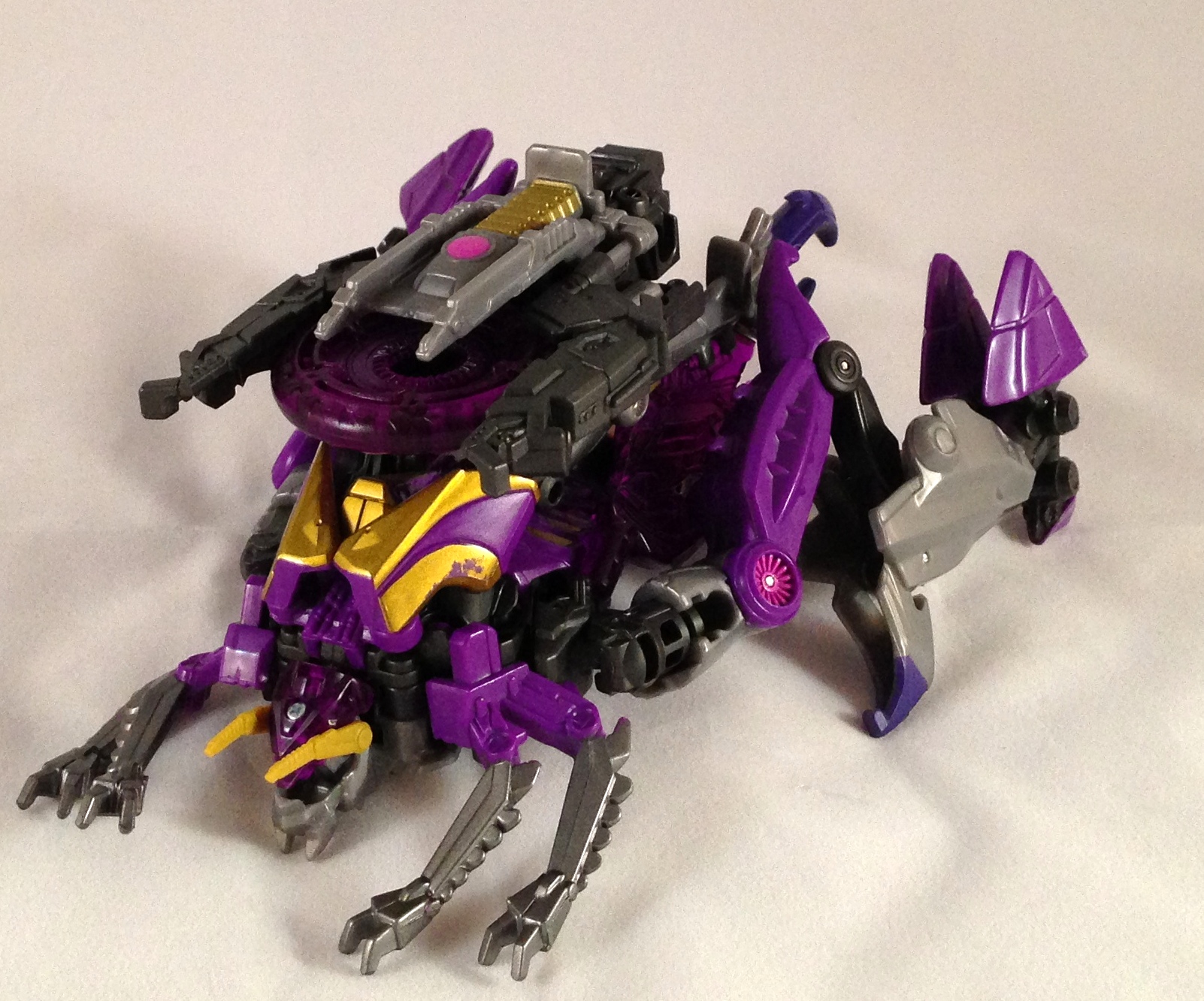 The first thing I noticed about him is that he has a really well defined “A-Frame” appearance. His legs are very thick his torso is lean and tapering, a very good design for a bad-guy. His coloring surprised me a bit as he has metallic gold which almost seems like he’s from Takara, but the rest of him is matte grey and purple so, he’s obviously not. As with some of the other Fall of Cybertron toys, there’s a couple of ways you can transform him in robot mode. I tend to keep him in a more “G1” styled look, so his longer “legs” stay back and up (like the wings on G1) and his insect arms I keep folded “Morphius” style behind his back :