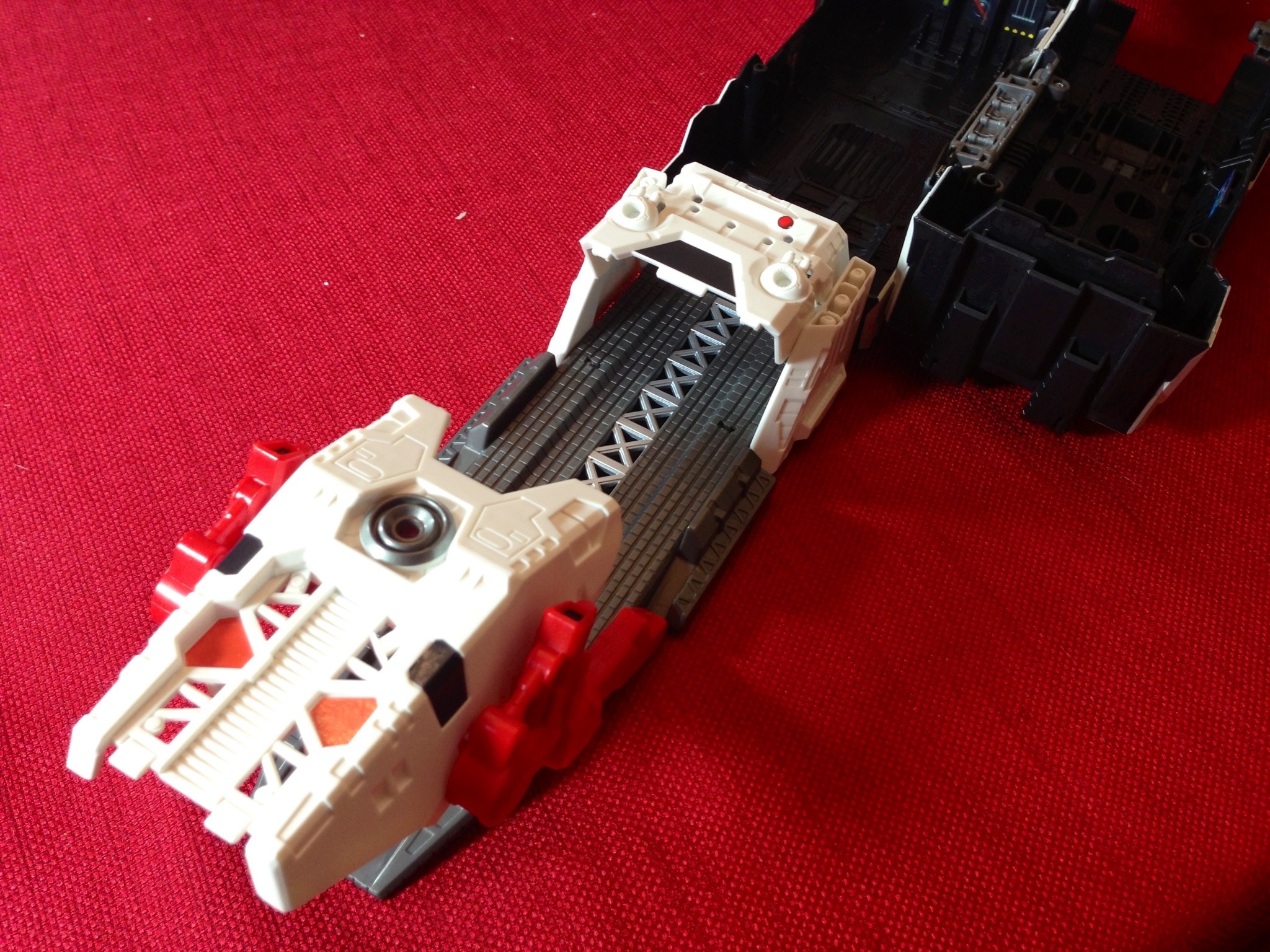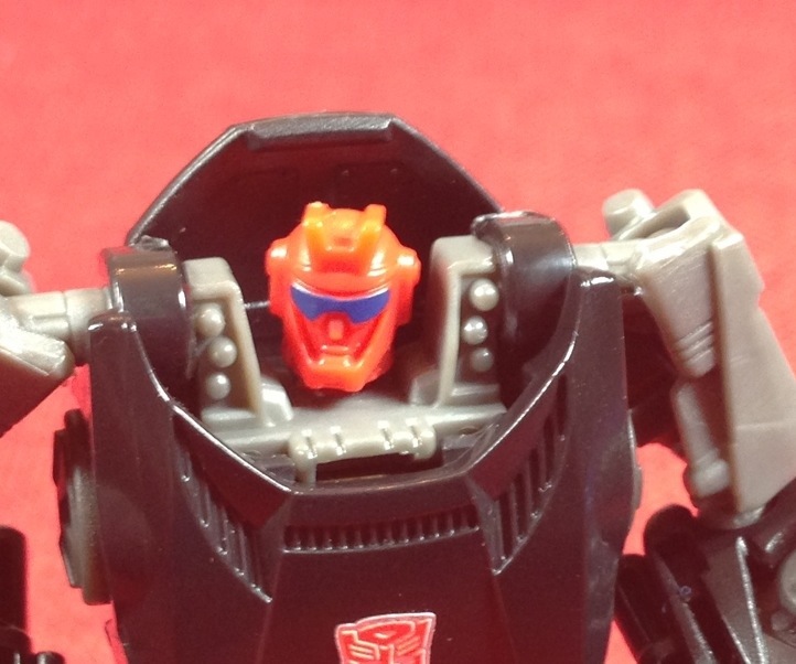 The head no longer collapses into the body (mainly because of the electronics) but instead, the “helmet” section rotates forward to cover the face. It’s quite a bit more successful than the G1 versions attempt to hide the head, and there is a panel that flips up to resemble a terminal or command post.
