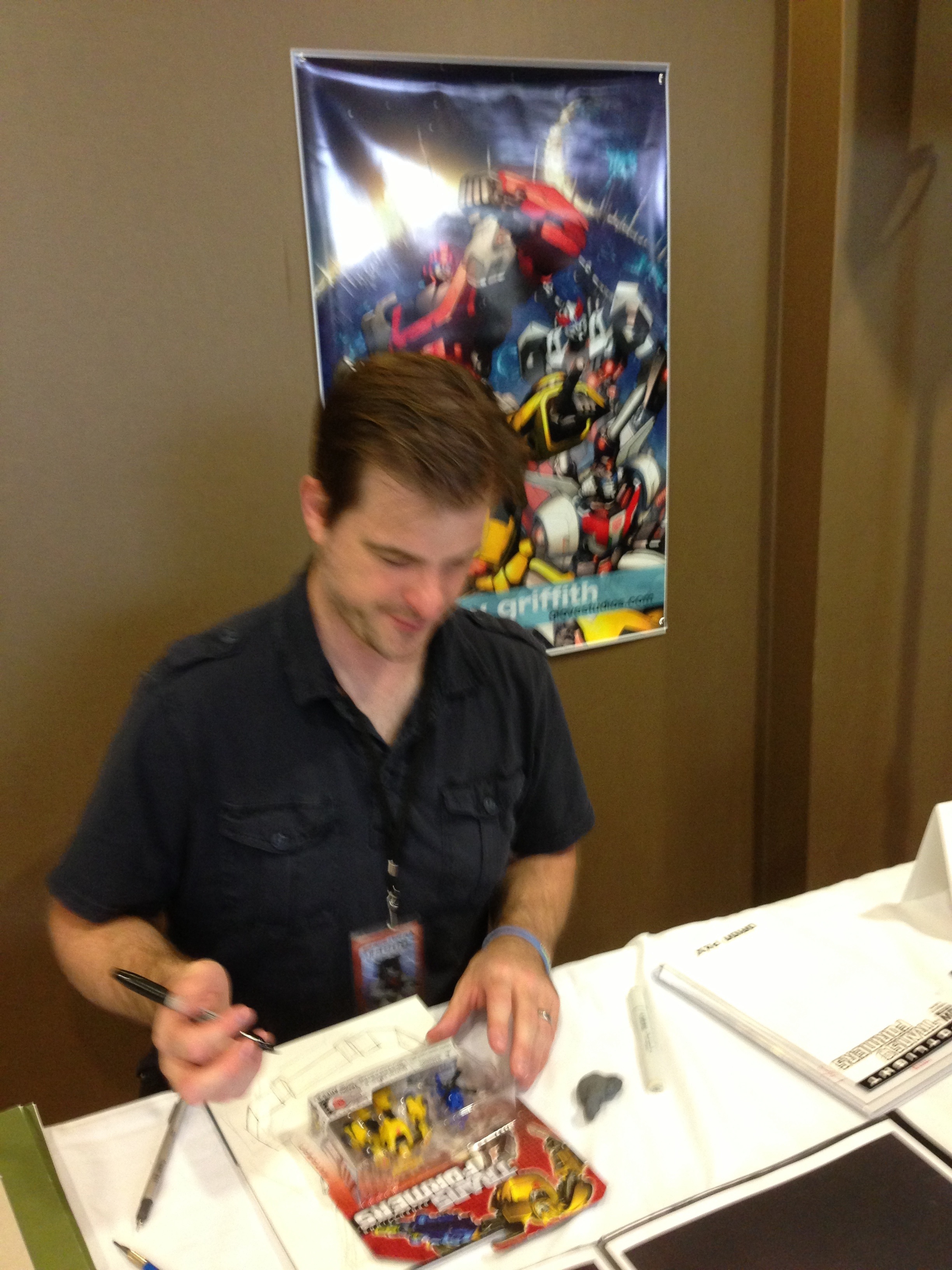 On Friday, I finally got to meet my Twitter-bro Abe face to face, and we were instant buds. He introduced me to his buddy Gus and the Three of us were hanging out and having a good time at the bar. That’s when Andrew Griffith showed up. Andrew draws the Robots in Disguise comics. I was very excited that I got to meet him: