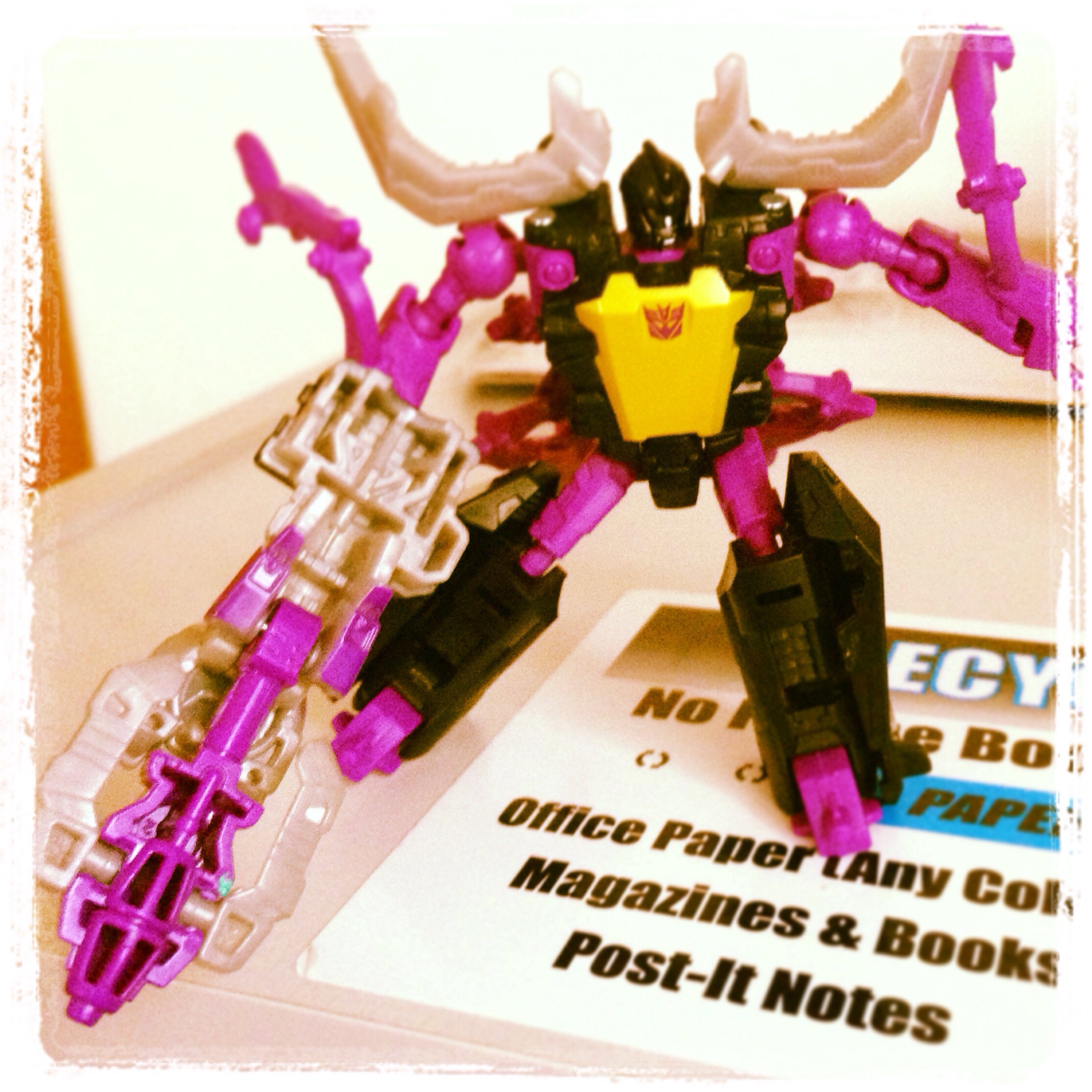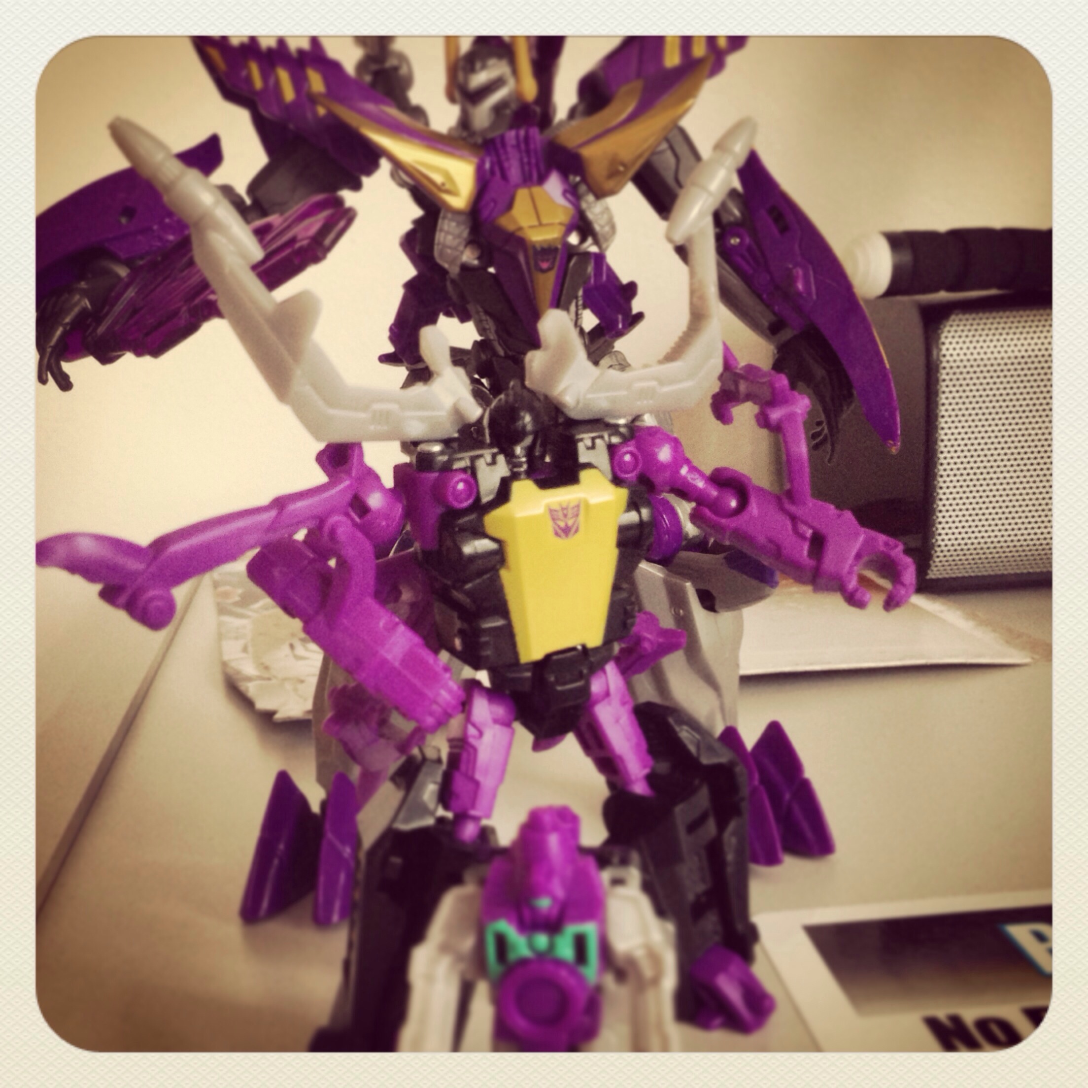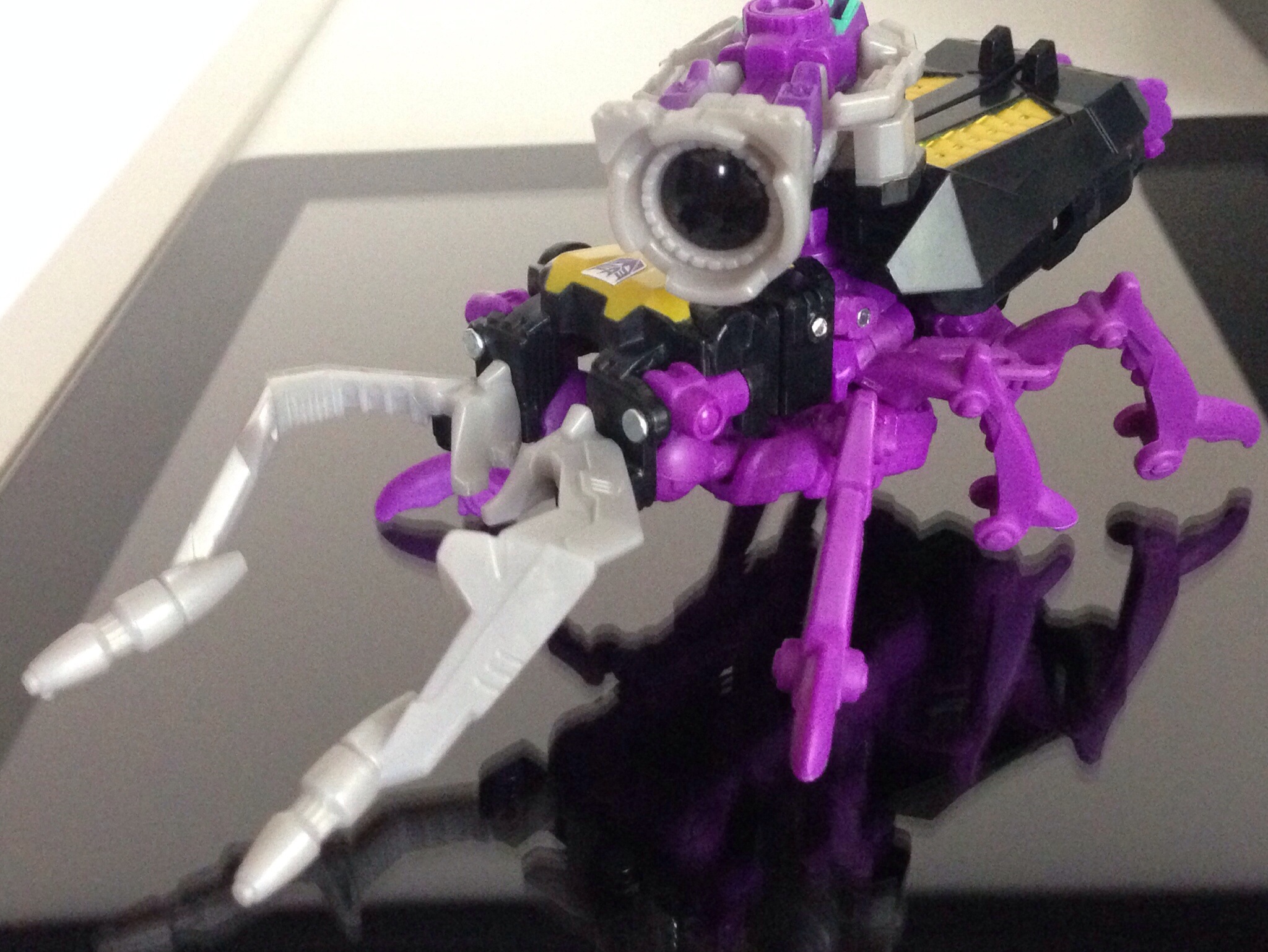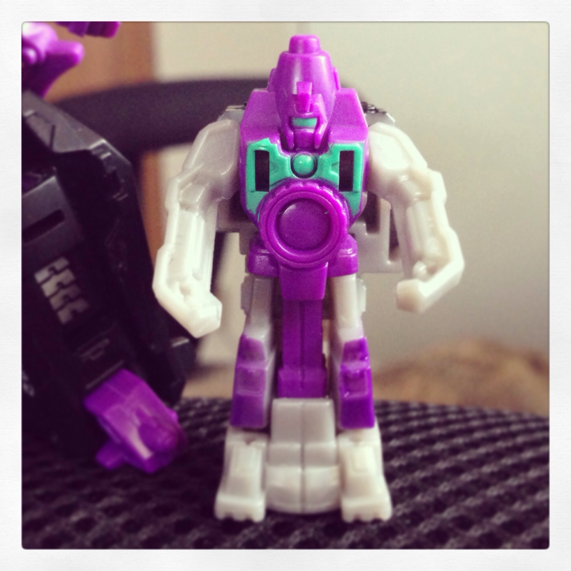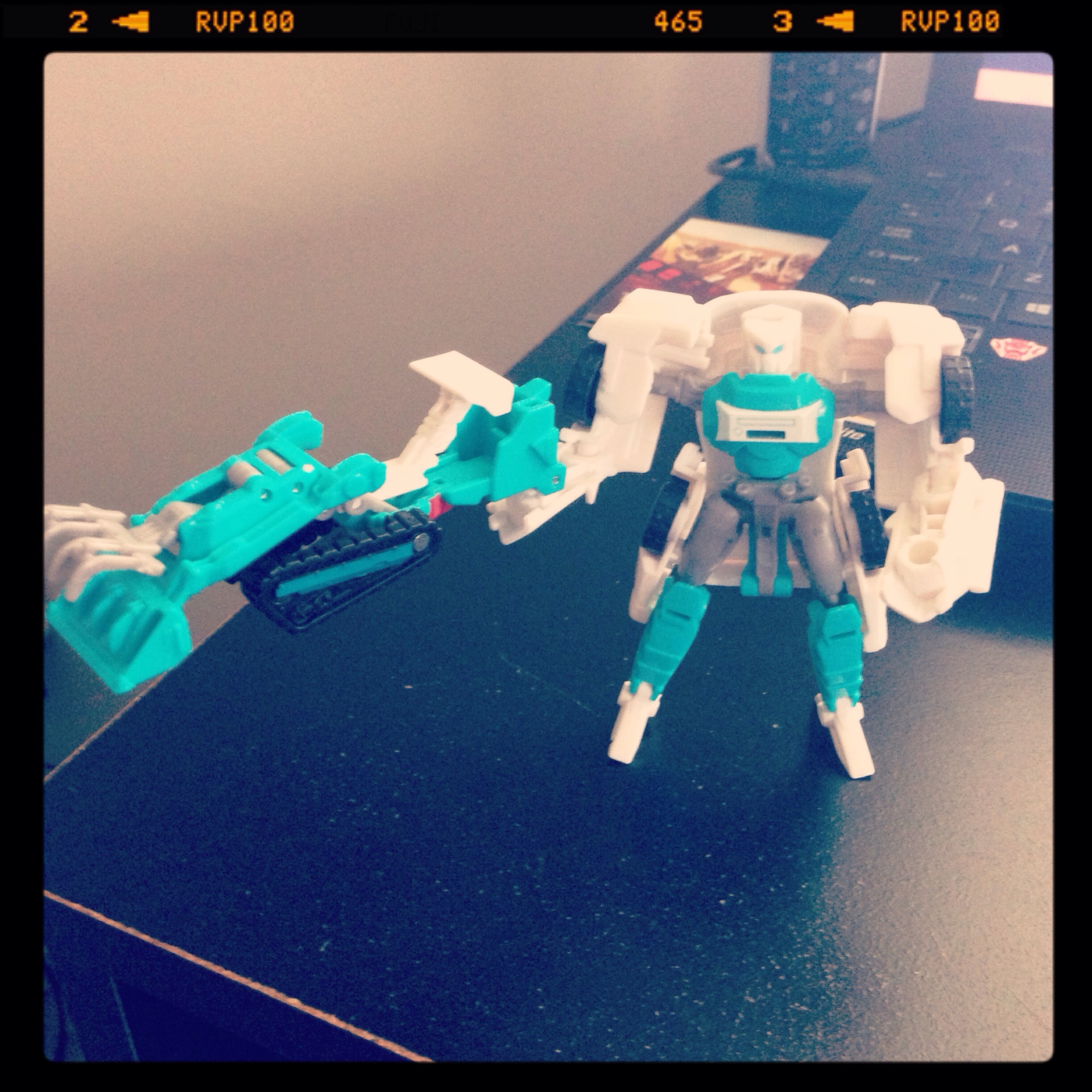 The Target Master partners are in the same boat. While Tailgate’s “Groundbreaker” partner is a cool little bomb-disposal lift, his robot mode is very bland and his huge arm molds don’t help. Shrapnel on the other hand, comes with friggin REFLECTOR! Who turns into not only a G1-accurate gun, but Also a friggin Camera! His robot mode is based more on the G1 toy’s robot mode (or at least the center robot of the three) but he’s retains his G1-cartoon colors of green and purple. SO COOL!