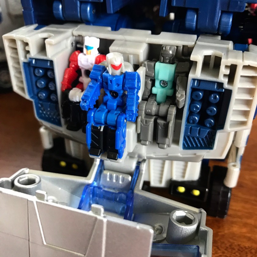 The trailer itself can hold up to three Headmasters, which is a direct call back to the intro of the cartoon where the three Headmaster Juniors, Shuta, Cab and Minerva are all inside.