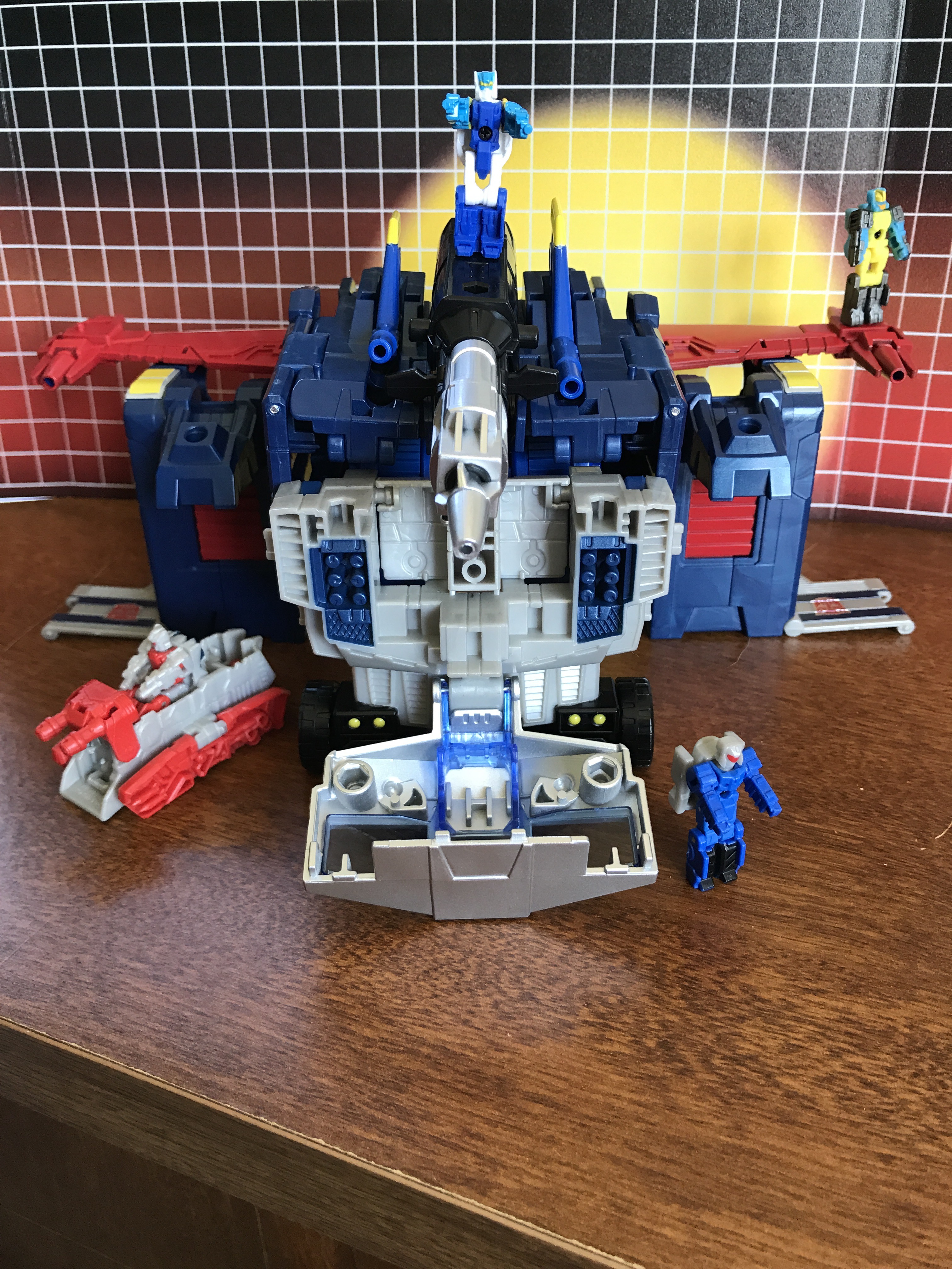 The trailer itself can hold up to three Headmasters, which is a direct call back to the intro of the cartoon where the three Headmaster Juniors, Shuta, Cab and Minerva are all inside.