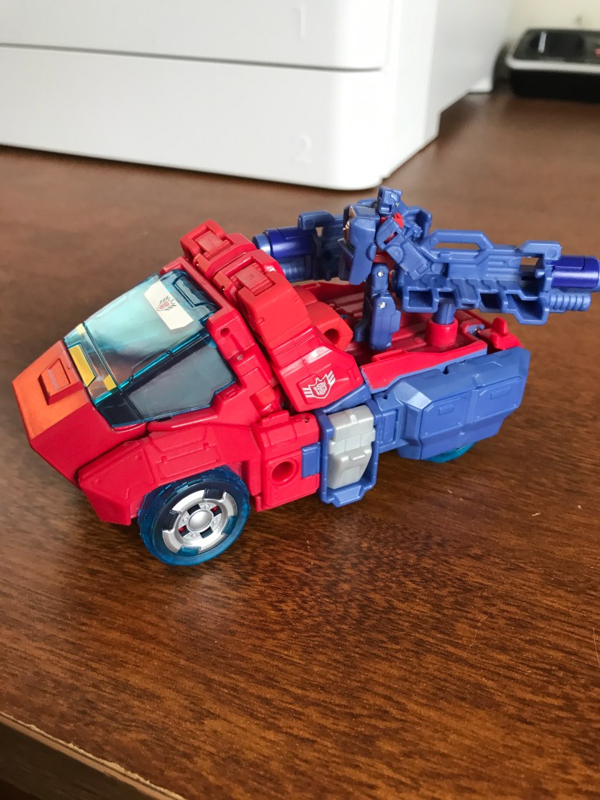 In truck mode, again, the Kup toy works really well conveying a much smaller vehicle mode for Orion Pax. The colors really pop and mounting the guns on the back help fill in the pick-up look as well!