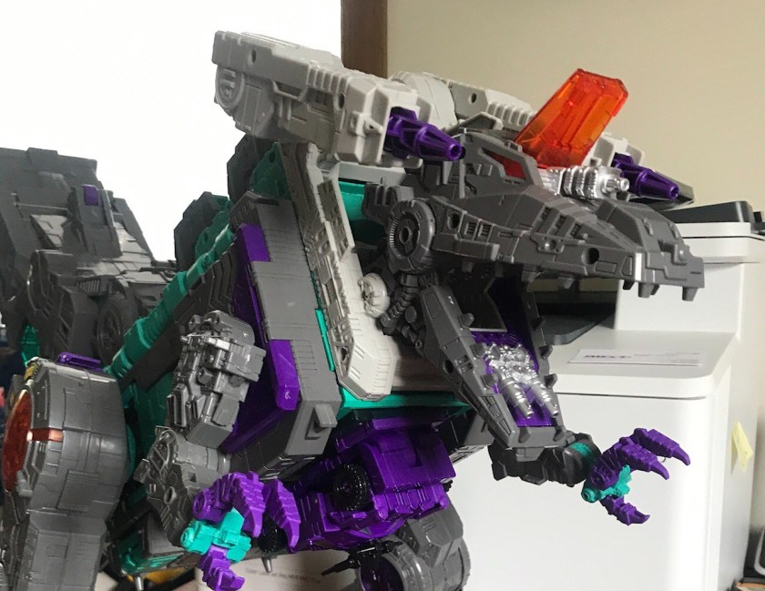 Trypticon brings back his three modes.  He has added posability to his Dinosaur mode in the hips, knees and little T-rex arms.  His neck/collar still functions nearly the exact way the G1 toys did, but that does allow for side to side movement.   His battle station mode is now dubbed battle ship mode and in another brilliant move, they’ve dubbed it the Nemesis.
