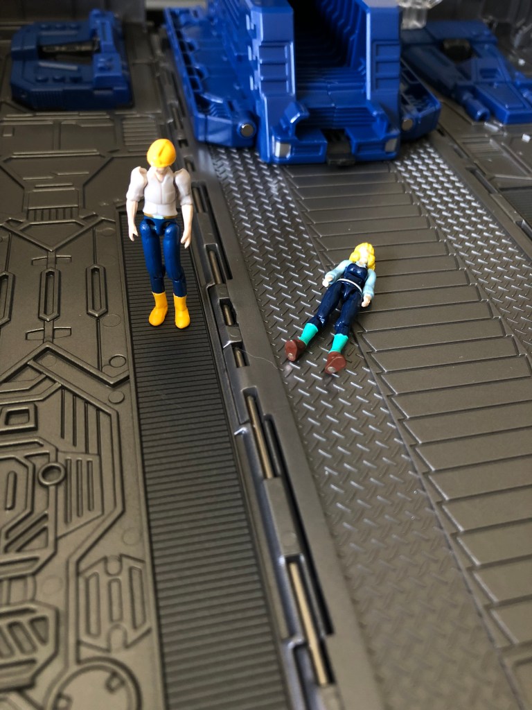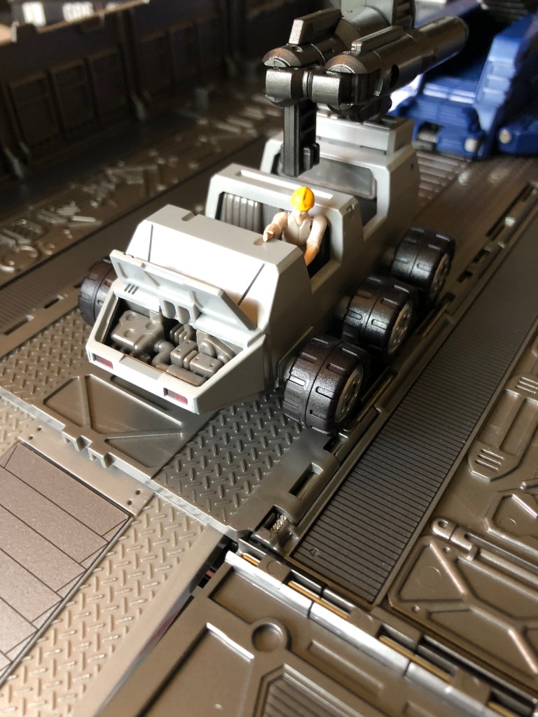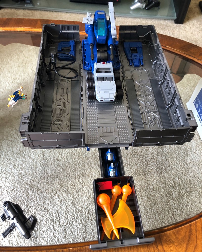 Roller has an accessible hood/engine, rotating mount for the trailer (Which I neglected to take a picture of) and has seating for four mini-figures. Optimus comes with Sparkplug, Spike and Carly, all three of which now feature magnets in their feet to adhere to new magnetic paneling in the trailer sides. The command tower/repair claw, now can detach and has flip out wheels that allow it to be a mobile anti-air defense. The trailers bottom assembly also slides out to store most of Optimus’ specific accessories – there are also ports in the trailer for his Ion Blaster and the tubed, oil gun. The Diaclone influences are highly incorporated into the toy, which is excellent.