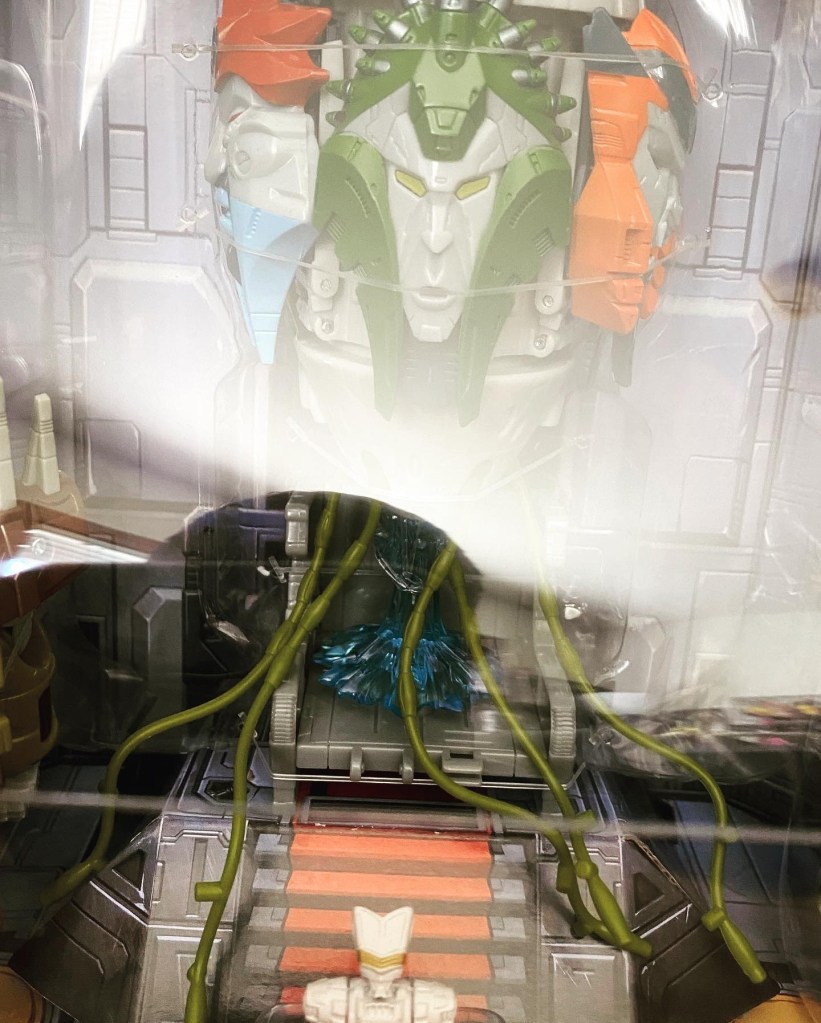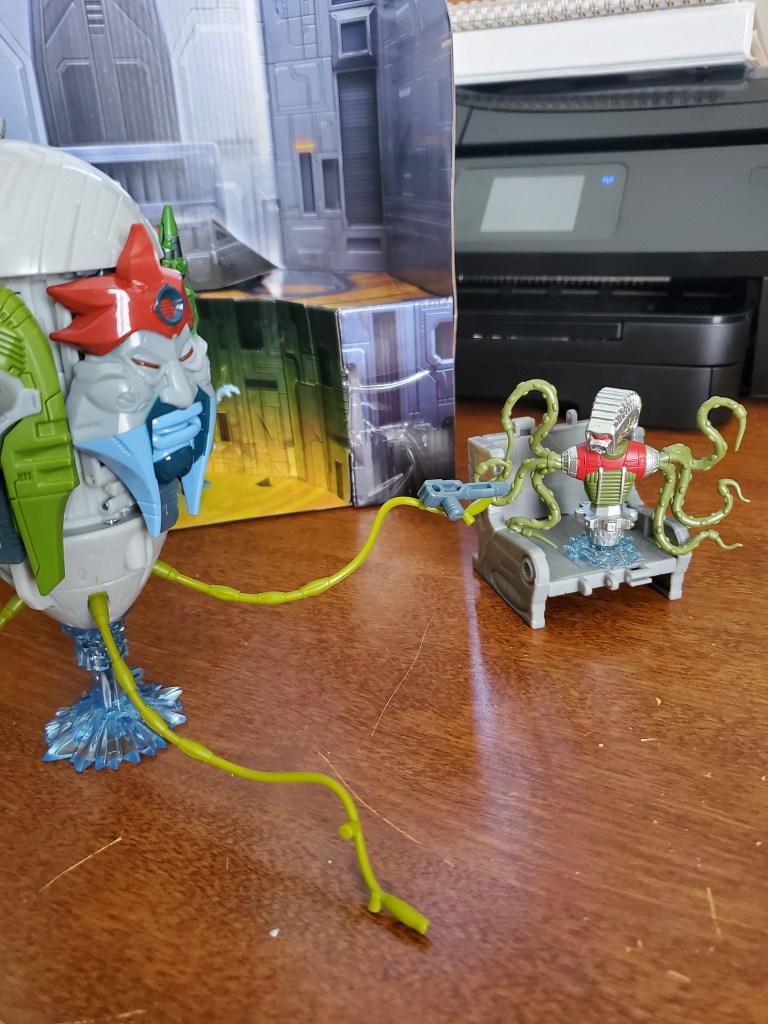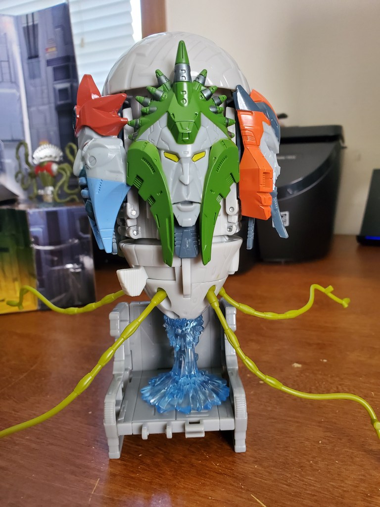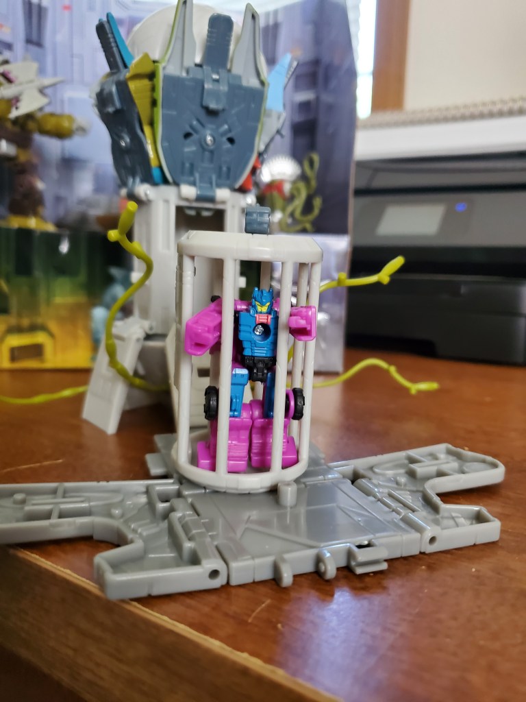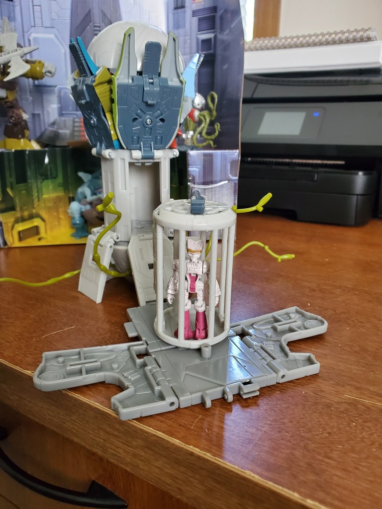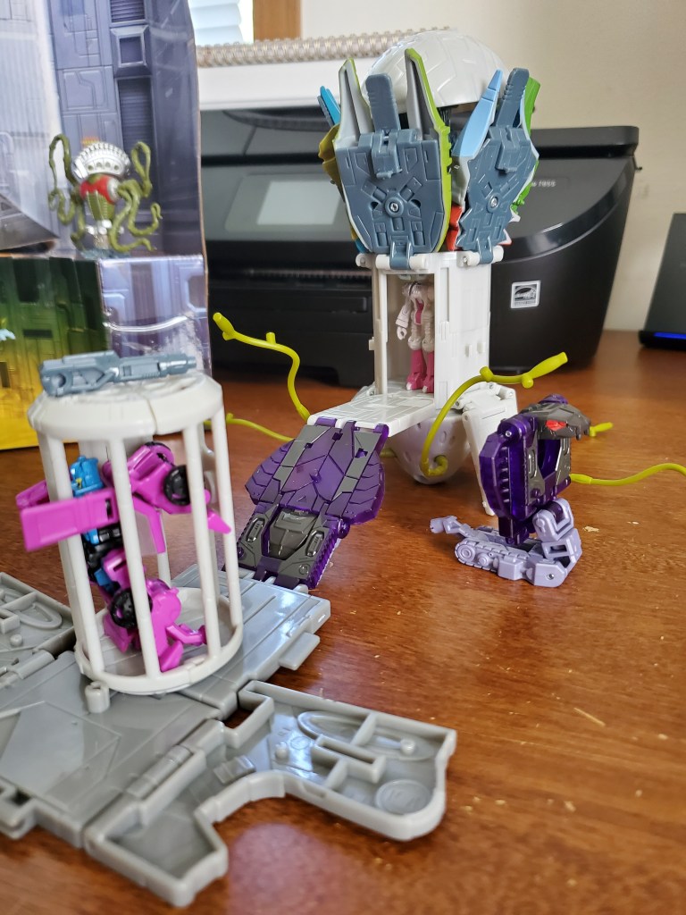The Centerpiece of the set. The Quintesson Judge is a brand new design and a “voyager” scaled toy. While the Cyberverse line surprised us with a somewhat crude version of a Judge late last year, this toy has all the bells and whistles! Five rotating faces, activated by a switch at the base, three of which feature articulated mouths! Flexible, posable tentacles, and again the clear blue hover effect molded into the base! He also features a throne that is incorporated into his transformation. Yes, that’s right, he transforms! His (their?) alt-mode is a prison and power station! I love me some base-formers and am thrilled he’s added to the roster! The little prison cell is also designed to fit a Battle/Micro Master or, obviously, Kranix too! You can attach Slitherfang (or any number of them) using A.I.R Lock system.